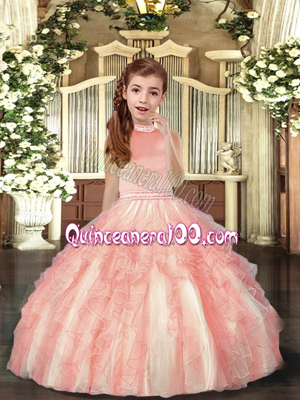 Neckline : Halter topShown Color : PeachSilhouette : Ball GownsSleeve Length : sleevelessHemline : floor lengthBack Detail : BacklessFabric : TulleEmbellishment : Beading,RufflesOccasion : Party,Sweet 16,Wedding PartySeason : Spring,Summer,Fall,Winter