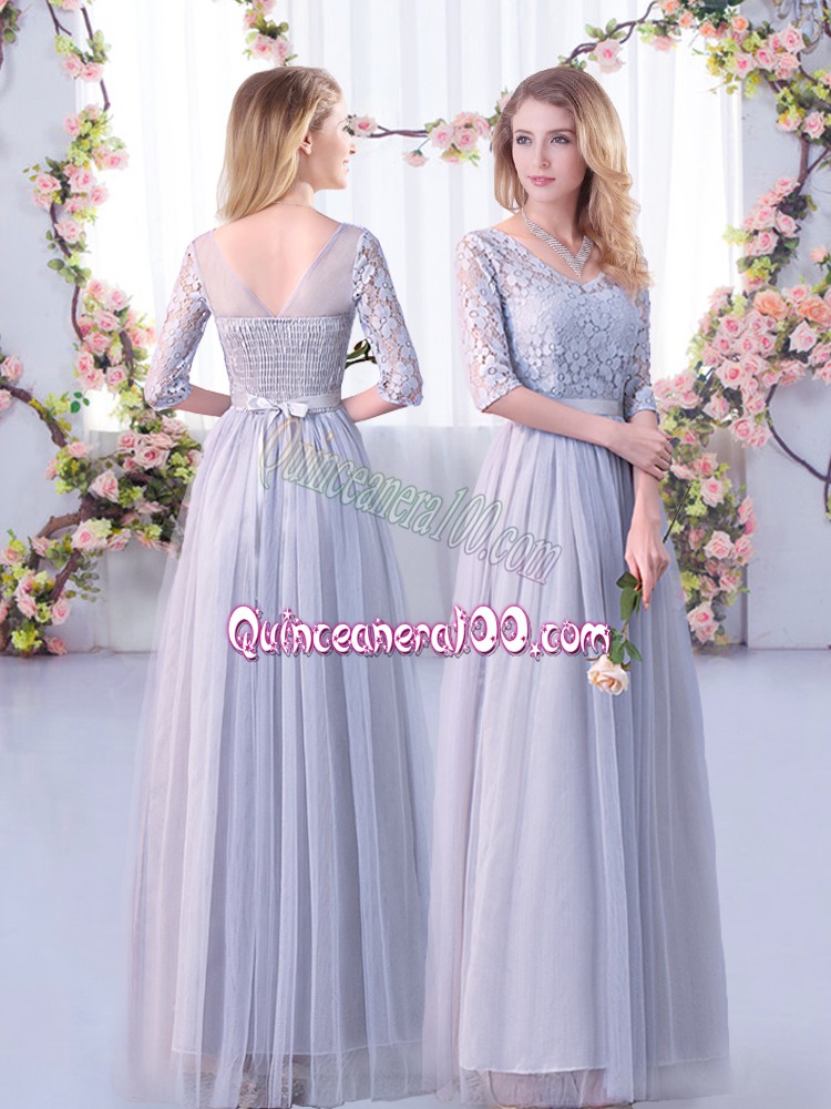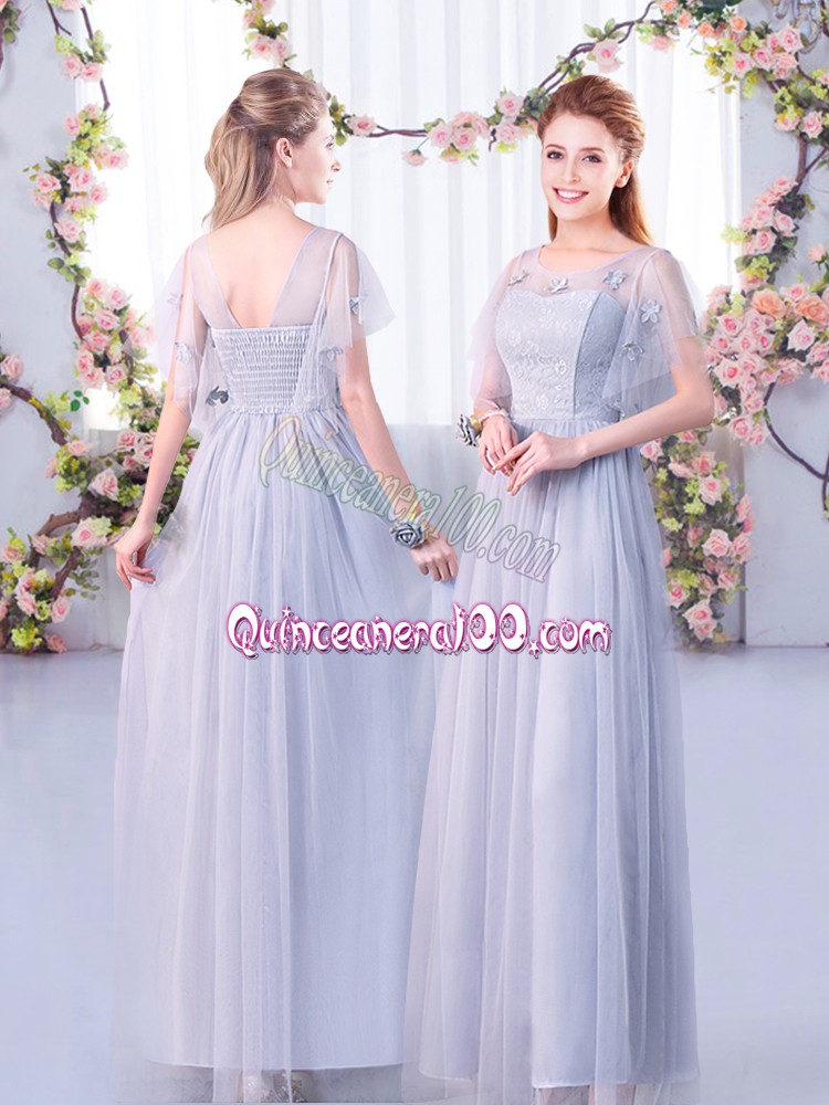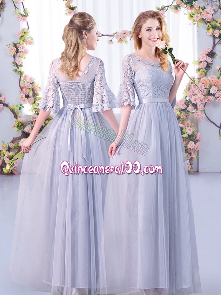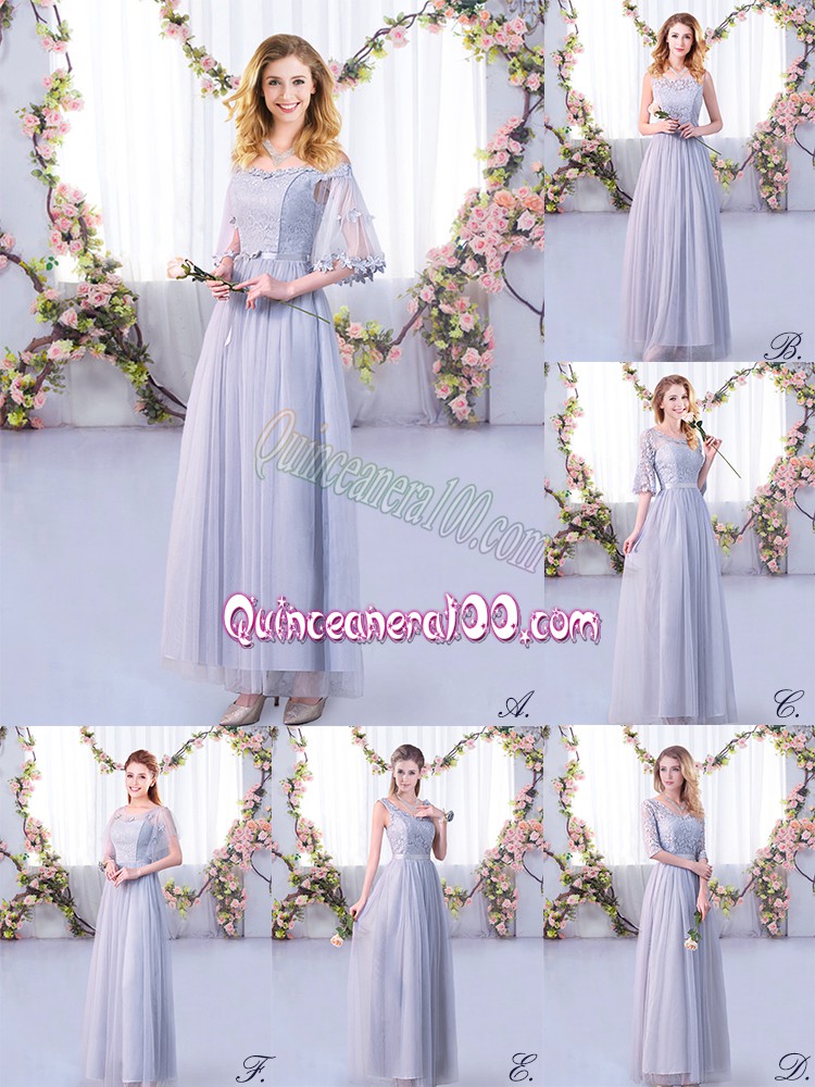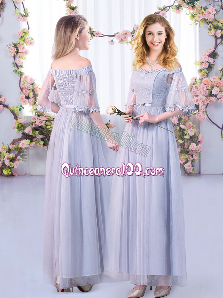 Neckline : Off the shoulderShown Color : GreySilhouette : EmpireSleeve Length : half sleevesHemline : floor lengthBack Detail : Side zipperFabric : TulleEmbellishment : Lace,BeltOccasion : Wedding PartySeason : Spring,Summer,Fall,Winter
