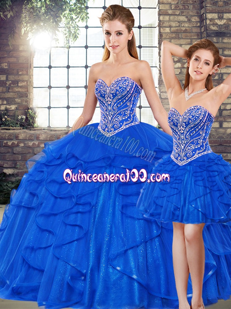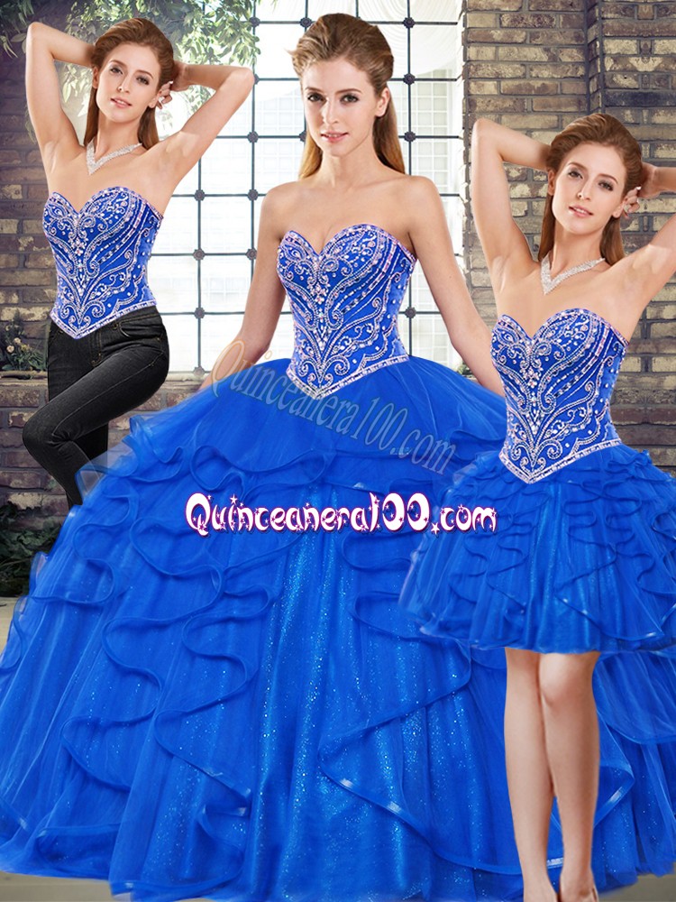 Neckline : Sweetheart Shown Color : Royal Blue Silhouette : Three Pieces Sleeve Length : sleeveless Hemline : floor length Back Detail : Lace up Fabric : Tulle Embellishment : Beading,Ruffles Occasion : Military Ball,Sweet 16,Quinceanera Season : Spring,Summer,Fall,Winter
