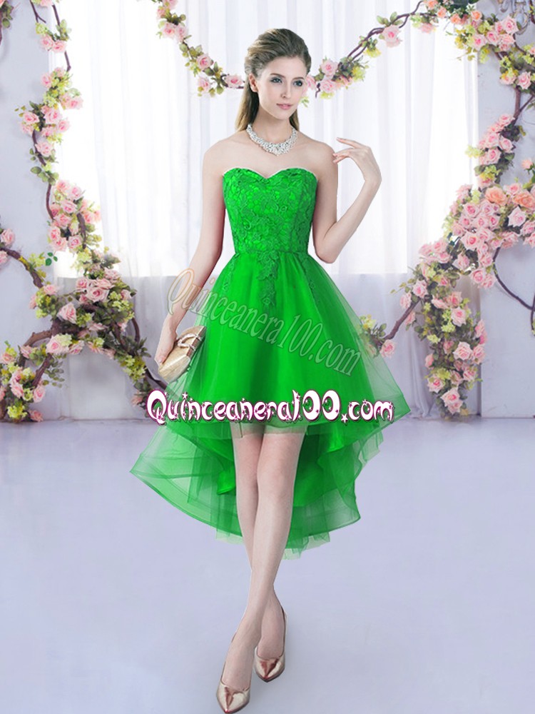 Neckline : SweetheartShown Color : GreenSilhouette : A-lineSleeve Length : sleevelessHemline : high lowBack Detail : Lace upFabric : TulleEmbellishment : LaceOccasion : Wedding PartySeason : Spring,Summer,Fall,Winter