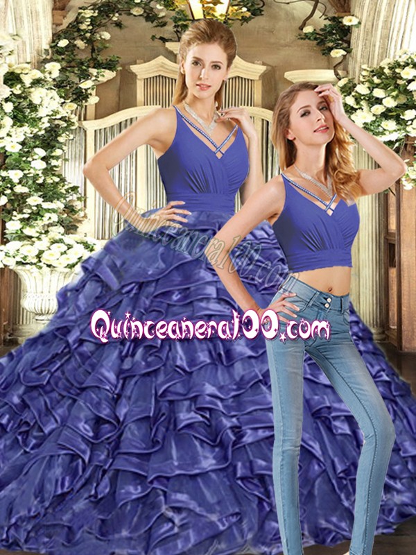 Neckline : V-neckShown Color : LavenderSilhouette : Two PiecesSleeve Length : sleevelessBack Detail : BacklessFabric : OrganzaEmbellishment : RufflesOccasion : Sweet 16,QuinceaneraSeason : Spring,Summer,Fall,Winter