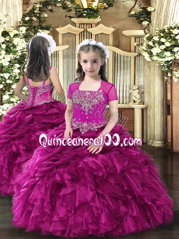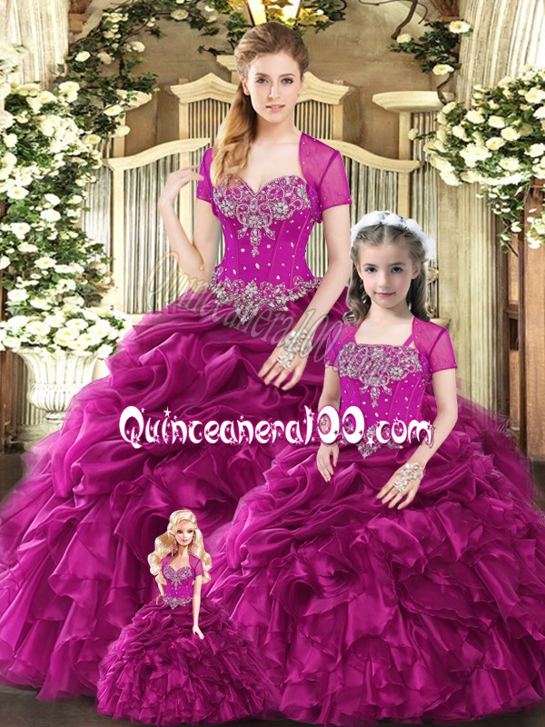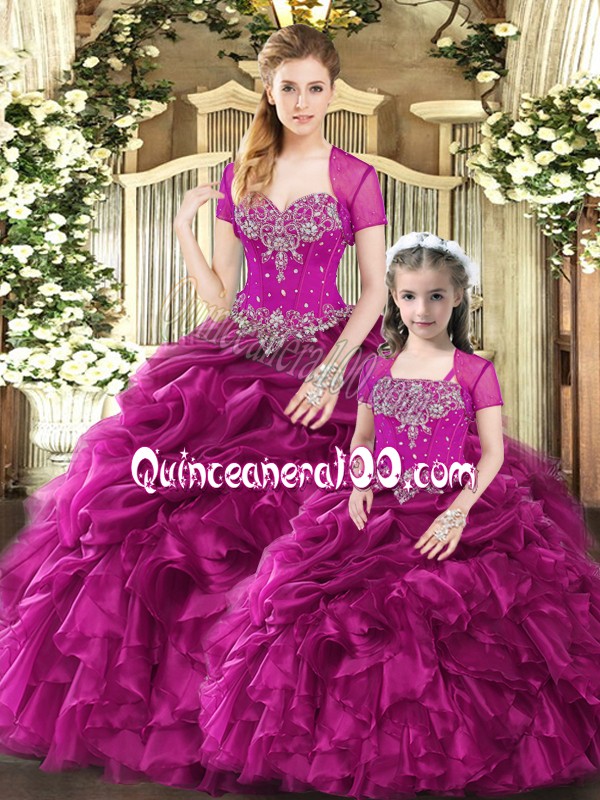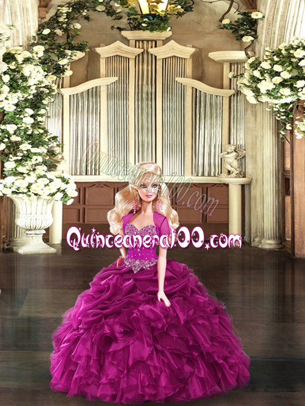 Neckline : SweetheartShown Color : FuchsiaSilhouette : Ball GownsSleeve Length : sleevelessHemline : floor lengthBack Detail : Lace upFabric : OrganzaEmbellishment : Beading,Ruffles,Pick UpsOccasion : Military Ball,Sweet 16,QuinceaneraSeason : Spring,Summer,Fall,Winter