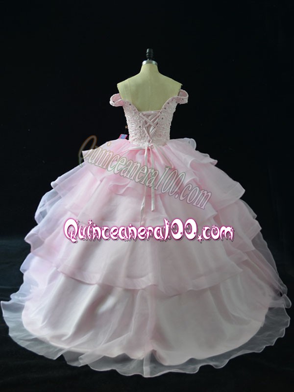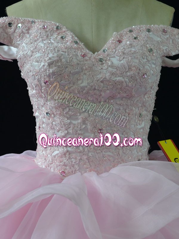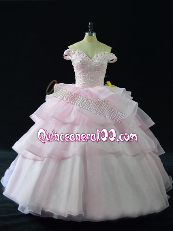Neckline : Off the shoulderShown Color : Pink Silhouette : Ball GownsSleeve Length : sleevelessBack Detail : Lace upFabric : OrganzaEmbellishment : Beading,Ruffled LayersOccasion : Sweet 16,QuinceaneraSeason : Spring,Summer,Fall,Winter