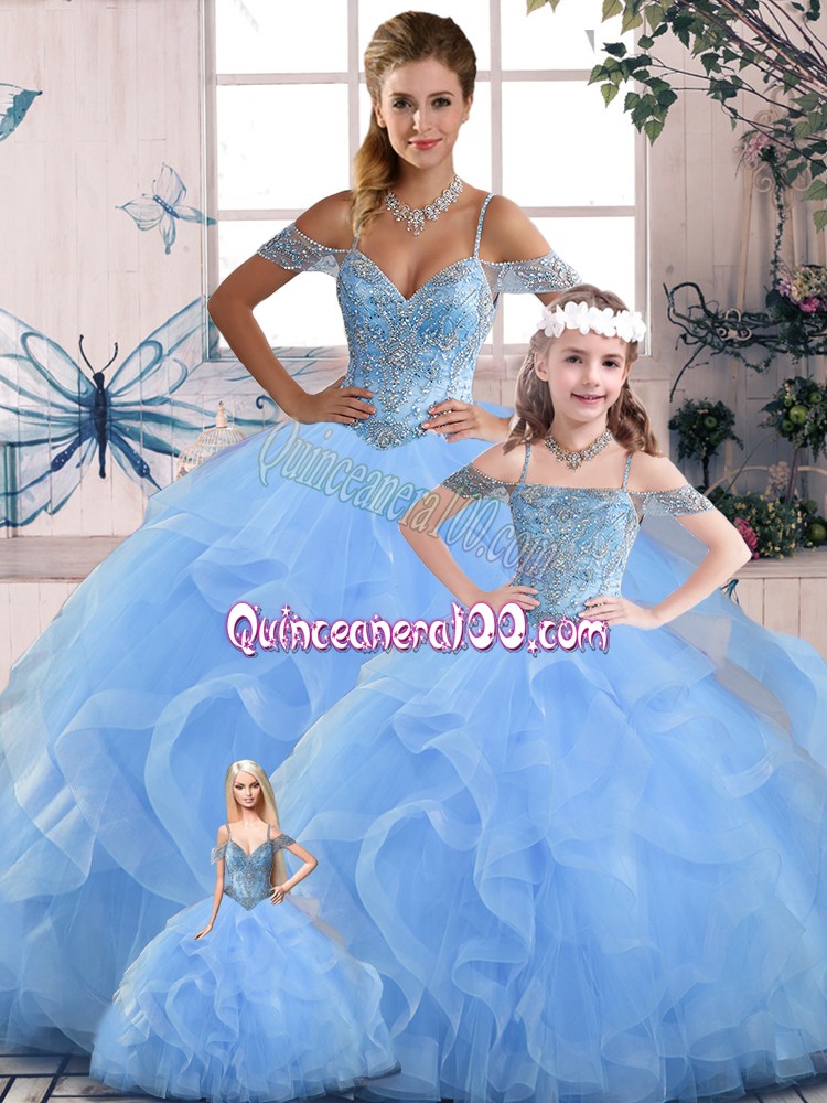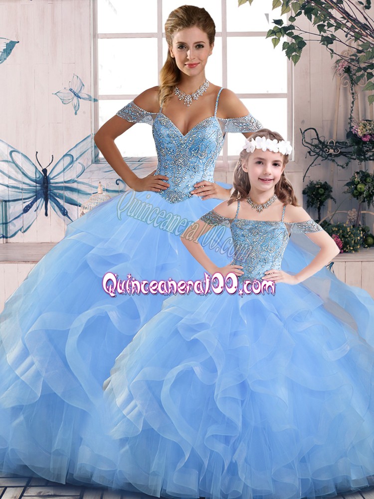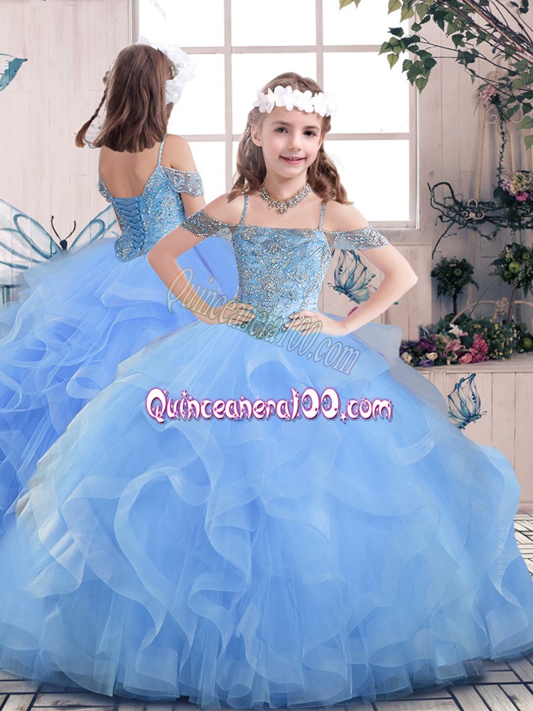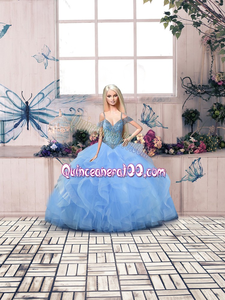Neckline : Off the shoulderShown Color : BlueSilhouette : Ball GownsSleeve Length : sleevelessHemline : floor lengthBack Detail : Lace upFabric : TulleEmbellishment : Beading,RufflesOccasion : Sweet 16,QuinceaneraSeason : Spring,Summer,Fall,Winter