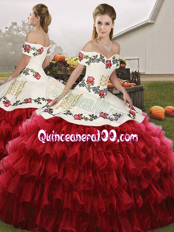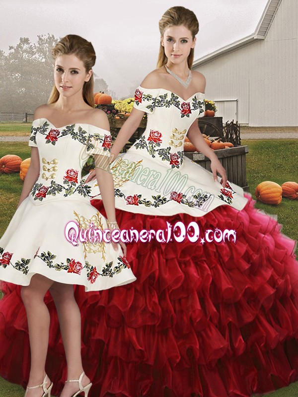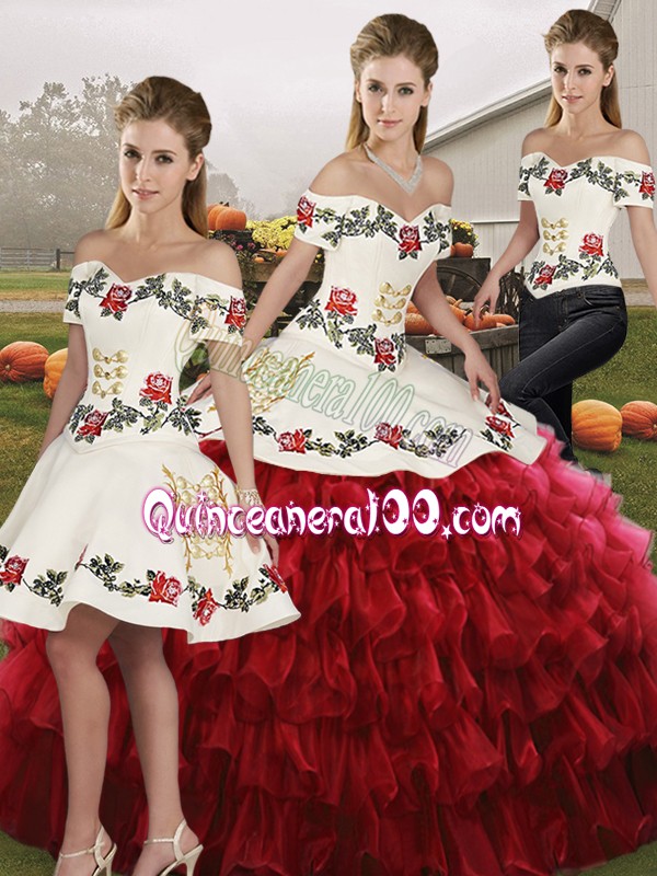 Neckline : Off the shoulder Shown Color : Wine Red Silhouette : Three Pieces Sleeve Length : sleeveless Hemline : floor length Back Detail : Lace up Fabric : Organza Embellishment : Embroidery,Ruffled Layers Occasion : Military Ball,Sweet 16,Quinceanera Season : Spring,Summer,Fall,Winter