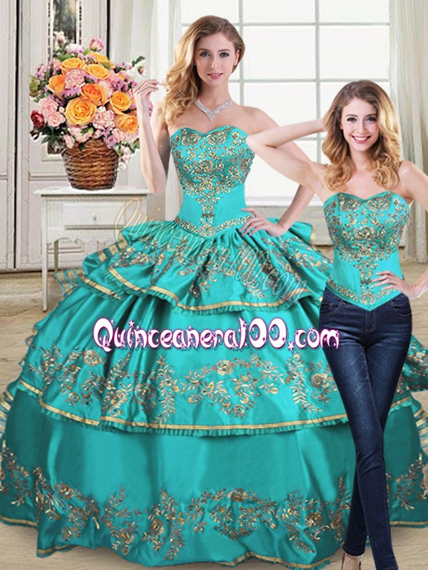 Neckline : SweetheartShown Color : Aqua BlueSilhouette : Two PiecesSleeve Length : sleevelessHemline : floor lengthBack Detail : Lace upFabric : OrganzaEmbellishment : Embroidery,Ruffled LayersOccasion : Sweet 16,QuinceaneraSeason : Spring,Summer,Fall,Winter