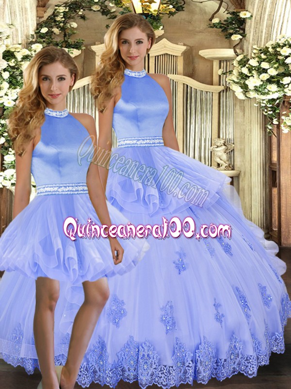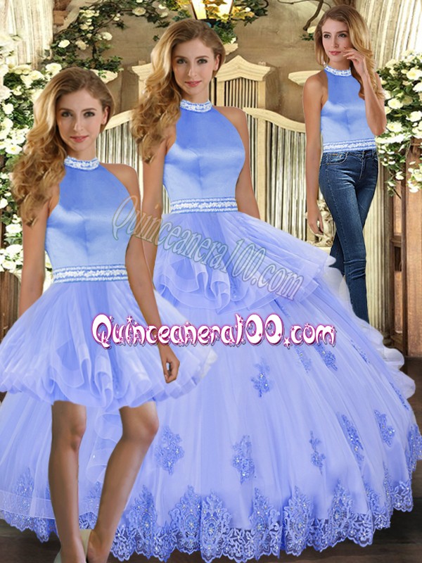 Neckline : Halter topShown Color : LavenderSilhouette : Three PiecesSleeve Length : sleevelessHemline : floor lengthBack Detail : BacklessFabric : TulleEmbellishment : Beading,AppliquesOccasion : Sweet 16,QuinceaneraSeason : Spring,Summer,Fall,Winter