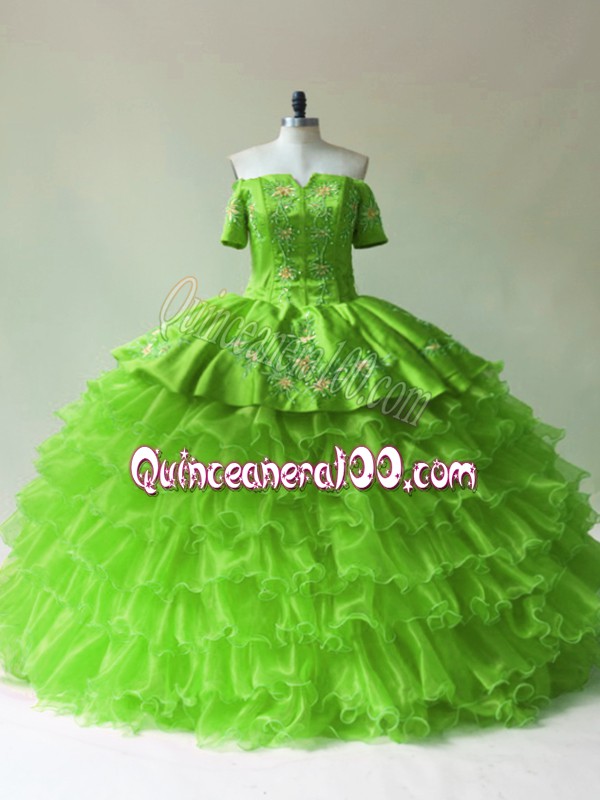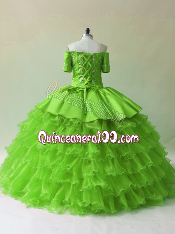 Neckline : Off the shoulderShown Color : Spring GreenSilhouette : Ball GownsSleeve Length : sleevelessHemline : floor lengthBack Detail : Lace upFabric : OrganzaEmbellishment : Embroidery,Ruffled LayersOccasion : Sweet 16,QuinceaneraSeason : Spring,Summer,Fall,Winter