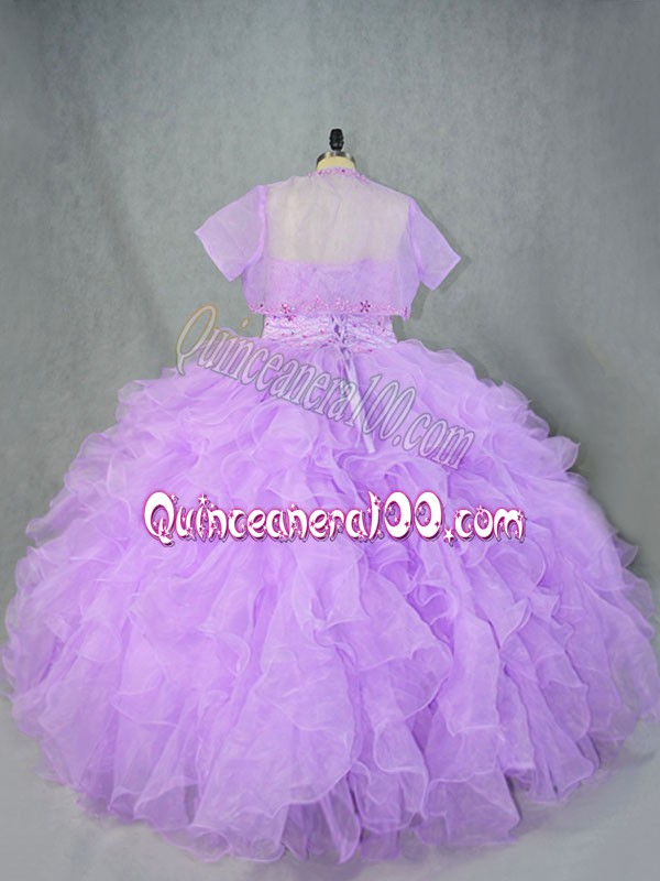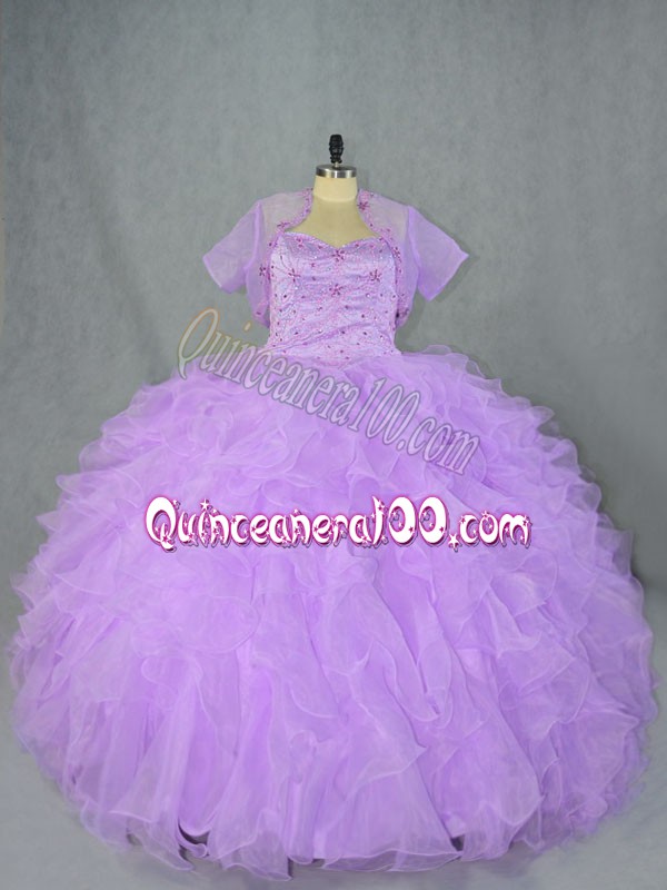 Neckline : SweetheartShown Color : LavenderSilhouette : Ball GownsSleeve Length : sleevelessHemline : asymmetricalBack Detail : Side zipperFabric : OrganzaEmbellishment : Beading,RufflesOccasion : Sweet 16,QuinceaneraSeason : Spring,Summer,Fall,Winter