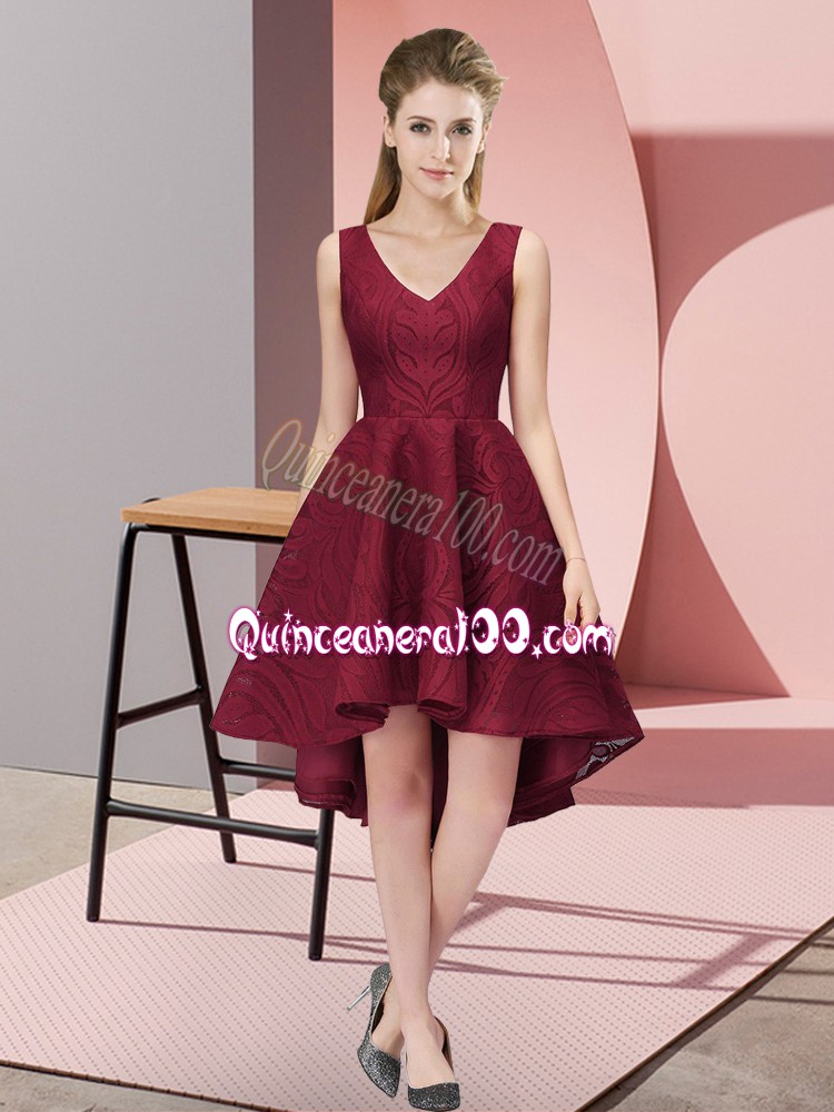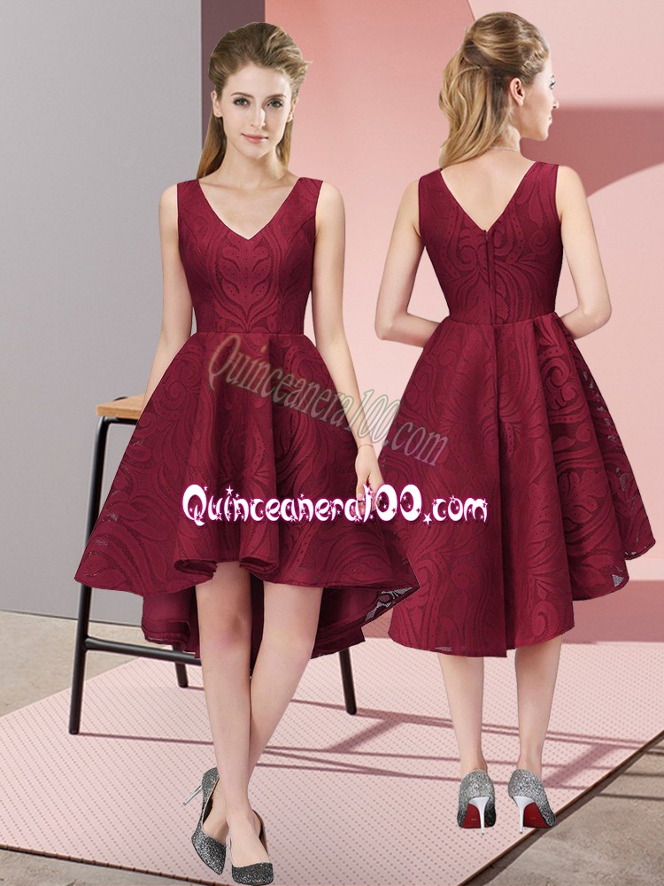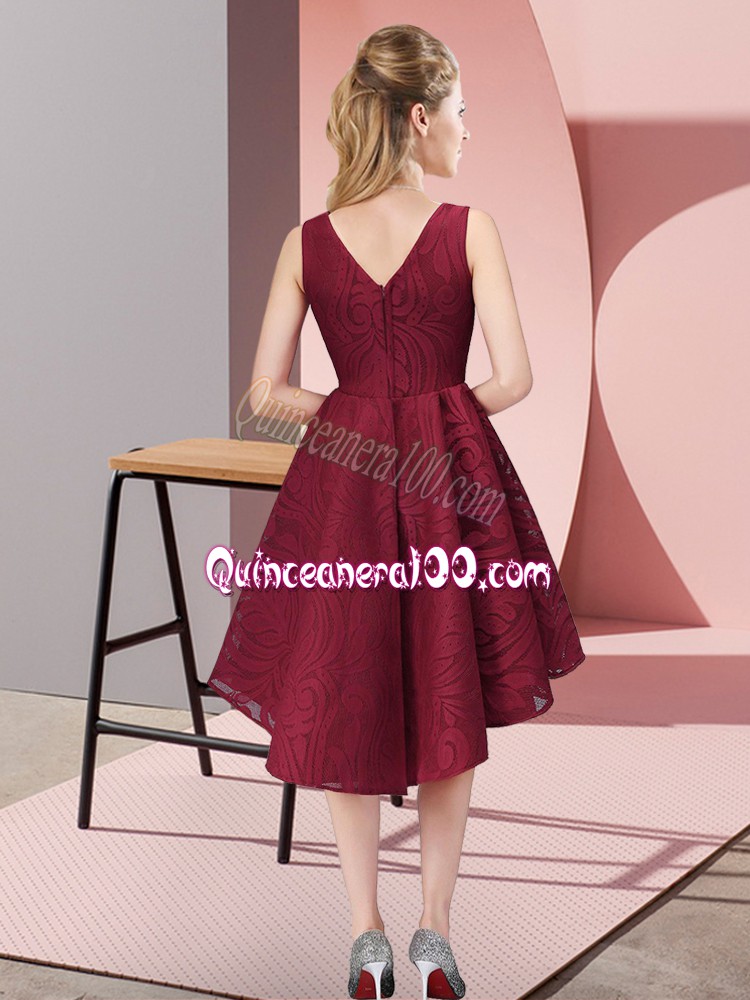 Neckline : V-neckShown Color : BurgundySilhouette : A-lineSleeve Length : sleevelessHemline : high lowBack Detail : ZipperFabric : LaceEmbellishment : LaceOccasion : Wedding PartySeason : Spring,Summer,Fall,Winter