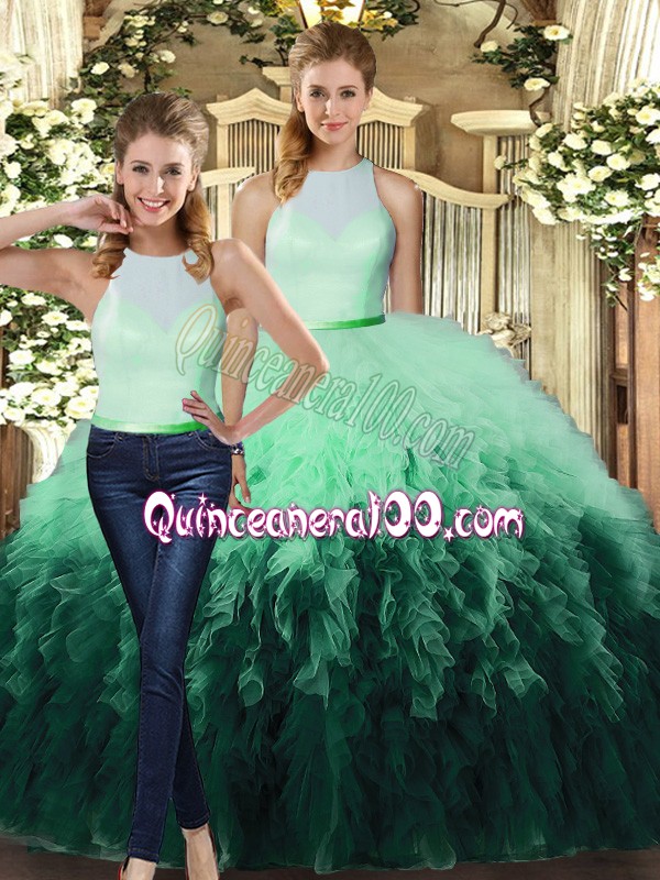Neckline : High-neckShown Color : Multi-colorSilhouette : Two PiecesSleeve Length : sleevelessHemline : floor lengthBack Detail : BacklessFabric : TulleEmbellishment : RufflesOccasion : Military Ball,Sweet 16,QuinceaneraSeason : Spring,Summer,Fall,Winter