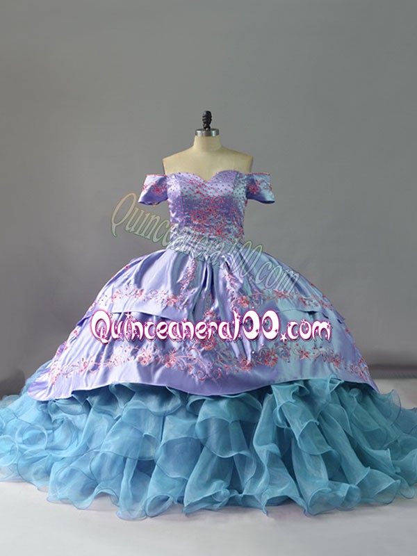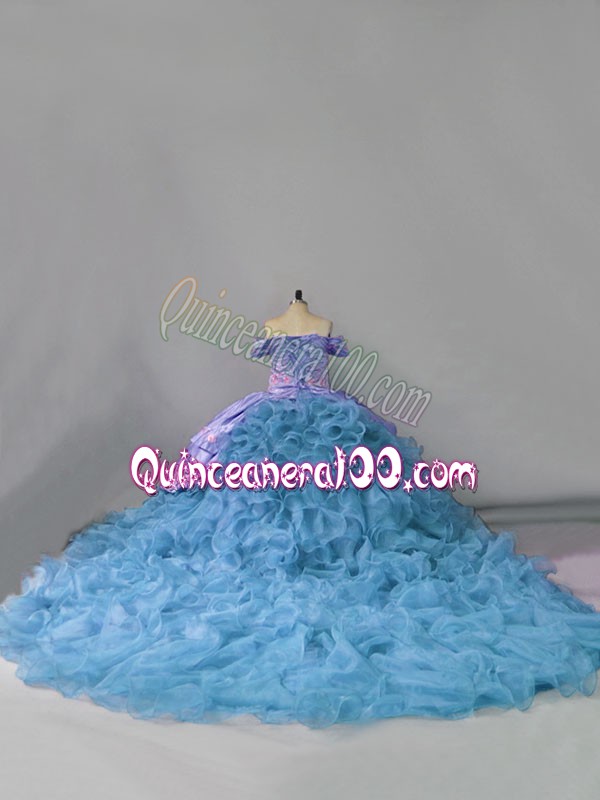 Neckline : Off the shoulderShown Color : BlueSilhouette : Ball GownsSleeve Length : sleevelessBack Detail : Lace upFabric : OrganzaEmbellishment : RufflesOccasion : Sweet 16,QuinceaneraSeason : Spring,Summer,Fall,Winter