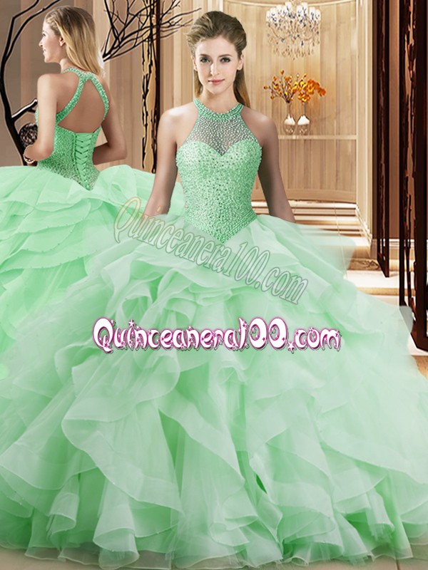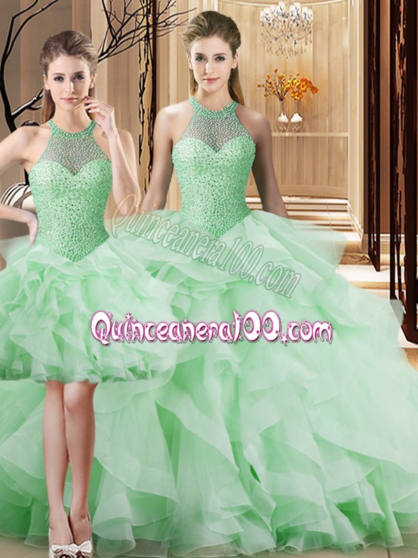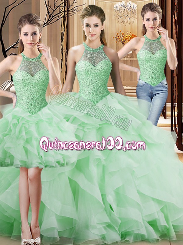 Neckline : Halter top Shown Color : Apple Green Silhouette : Three Pieces Sleeve Length : sleeveless Back Detail : Lace up Fabric : Organza Embellishment : Beading,Ruffles Occasion : Sweet 16,Quinceanera Season : Spring,Summer,Fall,Winter