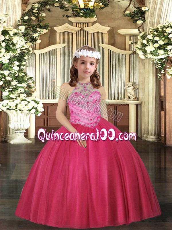 Neckline : Halter topShown Color : Hot PinkSilhouette : Ball GownsSleeve Length : sleevelessHemline : floor lengthBack Detail : Lace upFabric : TulleEmbellishment : BeadingOccasion : Party,Wedding PartySeason : Spring,Summer,Fall,Winter