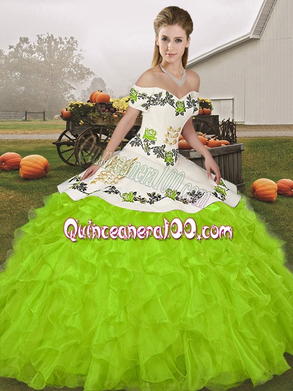 Neckline : Off the shoulderShown Color : Yellow GreenSilhouette : Ball GownsSleeve Length : sleevelessHemline : floor lengthBack Detail : Lace upFabric : OrganzaEmbellishment : Embroidery,RufflesOccasion : Military Ball,Sweet 16,QuinceaneraSeason : Spring,Summer,Fall,Winter