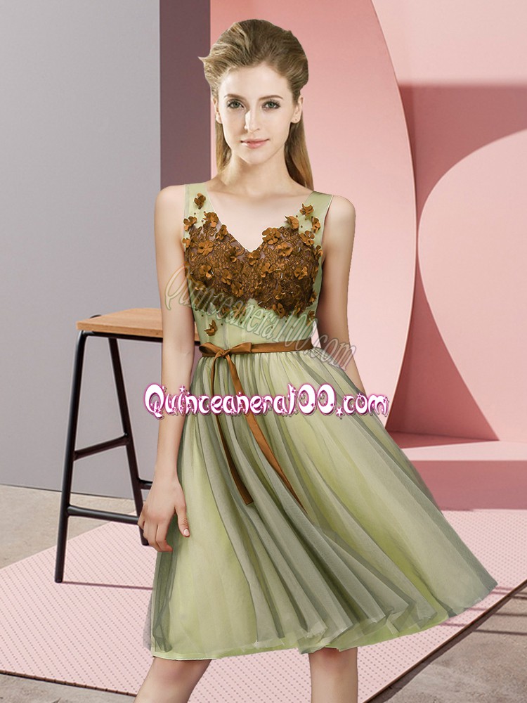 Neckline : V-neckShown Color : YellowSilhouette : EmpireSleeve Length : sleevelessHemline : knee lengthBack Detail : Lace upFabric : TulleEmbellishment : AppliquesOccasion : Wedding PartySeason : Spring,Summer,Fall