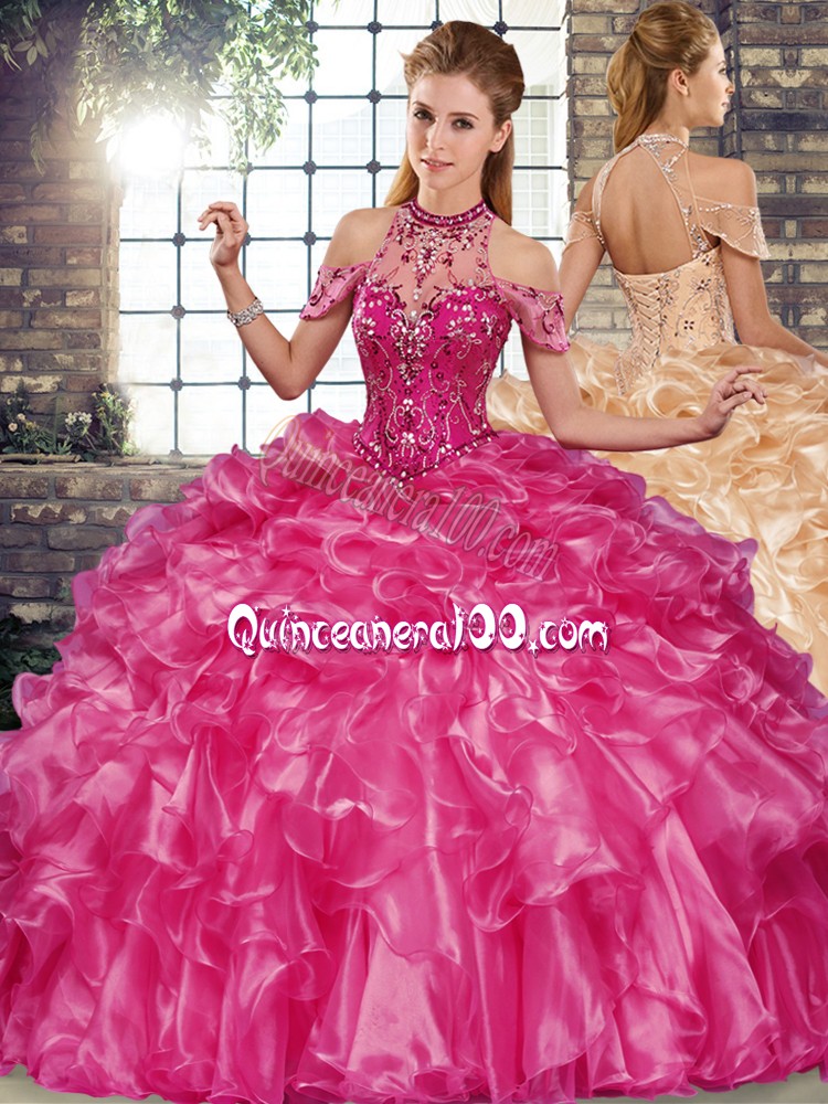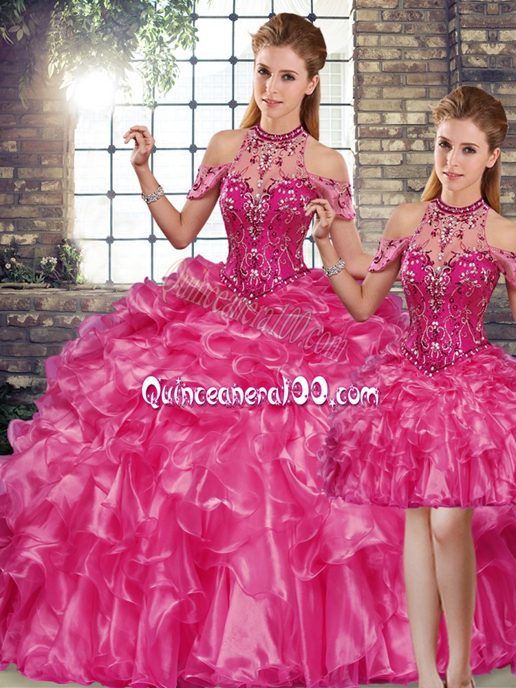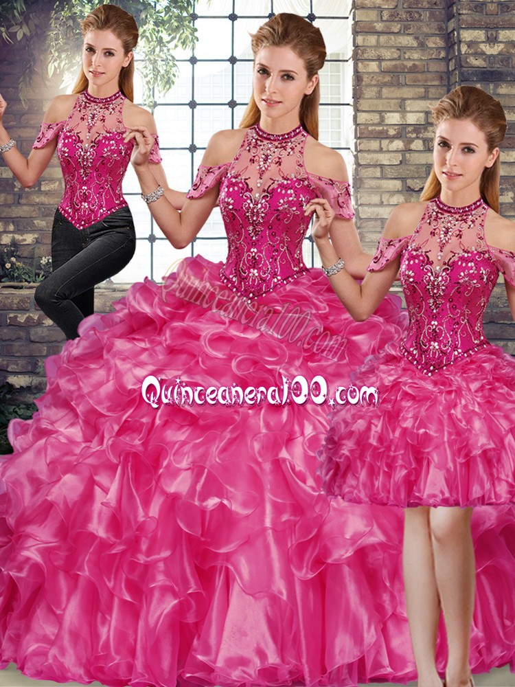 Neckline : Halter topShown Color : FuchsiaSilhouette : Three PiecesSleeve Length : sleevelessHemline : floor lengthBack Detail : Lace upFabric : OrganzaEmbellishment : Beading,RufflesOccasion : Military Ball,Sweet 16,QuinceaneraSeason : Spring,Summer,Fall,Winter