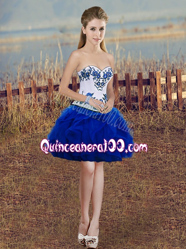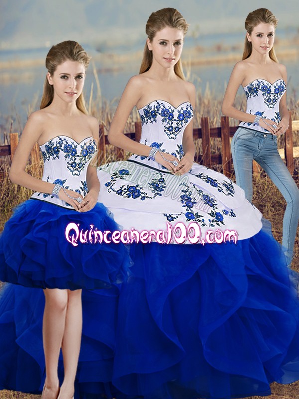 Neckline : Sweetheart Shown Color : Royal Blue Silhouette : Three Pieces Sleeve Length : sleeveless Hemline : floor length Back Detail : Lace up Fabric : Tulle Embellishment : Embroidery,Ruffles,Bowknot Occasion : Military Ball,Sweet 16,Quinceanera Season : Spring,Summer,Fall,Winter