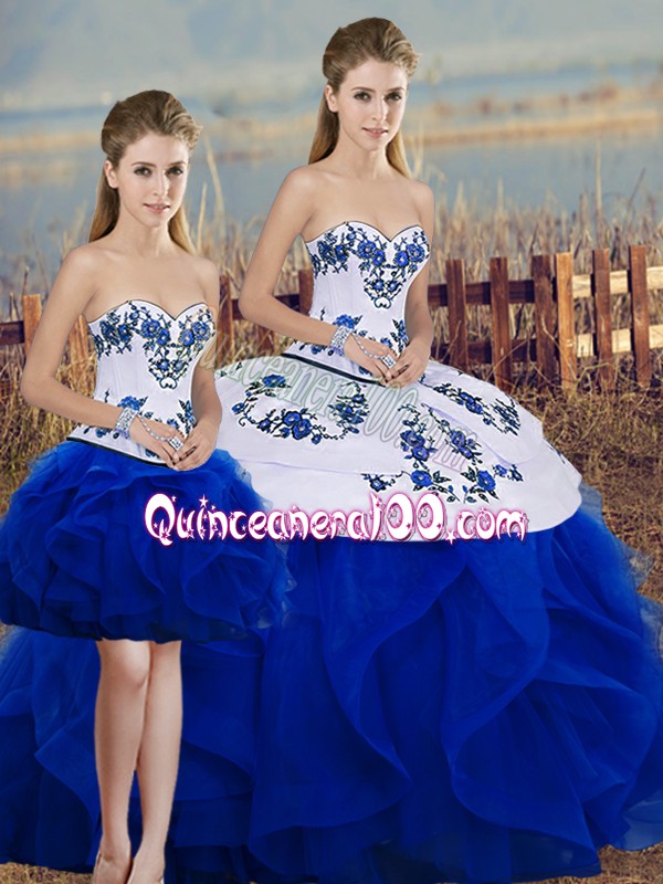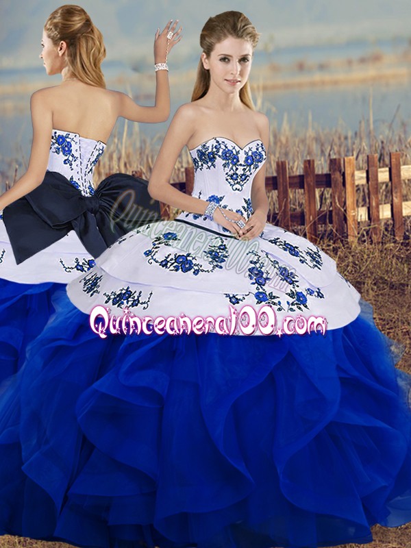 Fabulous Royal Blue Lace Up Quince Ball Gowns Embroidery and Ruffles and Bowknot Sleeveless Floor Length