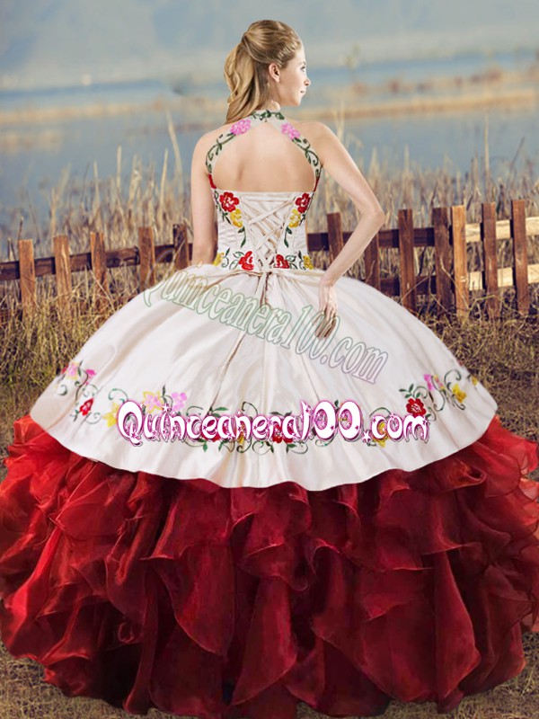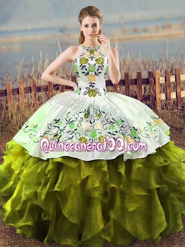 Neckline : Halter topShown Color : Olive GreenSilhouette : Ball GownsSleeve Length : sleevelessHemline : floor lengthBack Detail : Lace upFabric : OrganzaEmbellishment : Embroidery,RufflesOccasion : Sweet 16,QuinceaneraSeason : Spring,Summer,Fall,Winter
