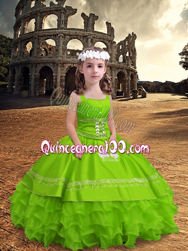 Neckline : StrapsShown Color : Yellow GreenSilhouette : Ball GownsSleeve Length : sleevelessHemline : floor lengthBack Detail : ZipperFabric : Satin,OrganzaEmbellishment : Embroidery,Ruffled LayersOccasion : Wedding PartySeason : Spring,Summer,Fall,Winter