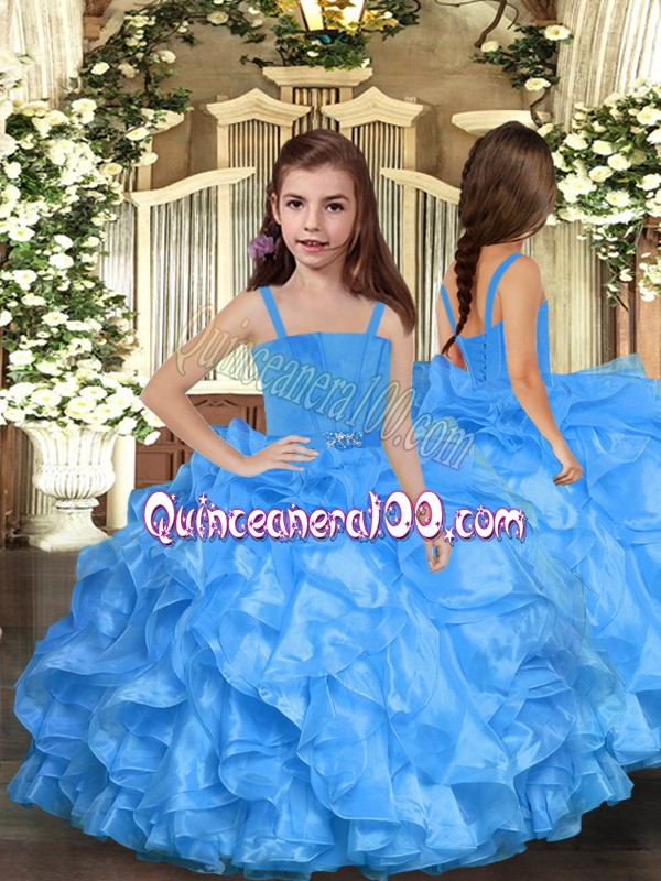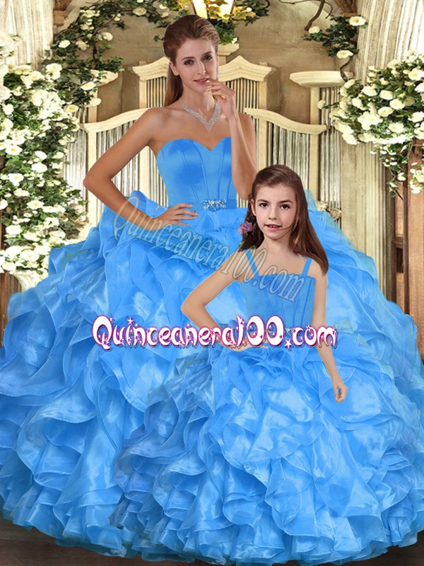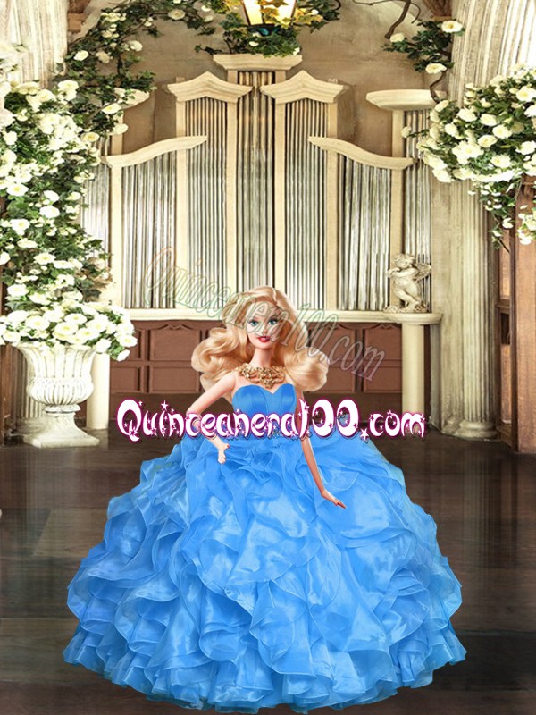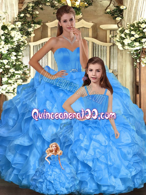 Neckline : SweetheartShown Color : Baby BlueSilhouette : Ball GownsSleeve Length : sleevelessHemline : floor lengthBack Detail : Lace upFabric : OrganzaEmbellishment : RufflesOccasion : Sweet 16,QuinceaneraSeason : Spring,Summer,Fall,Winter