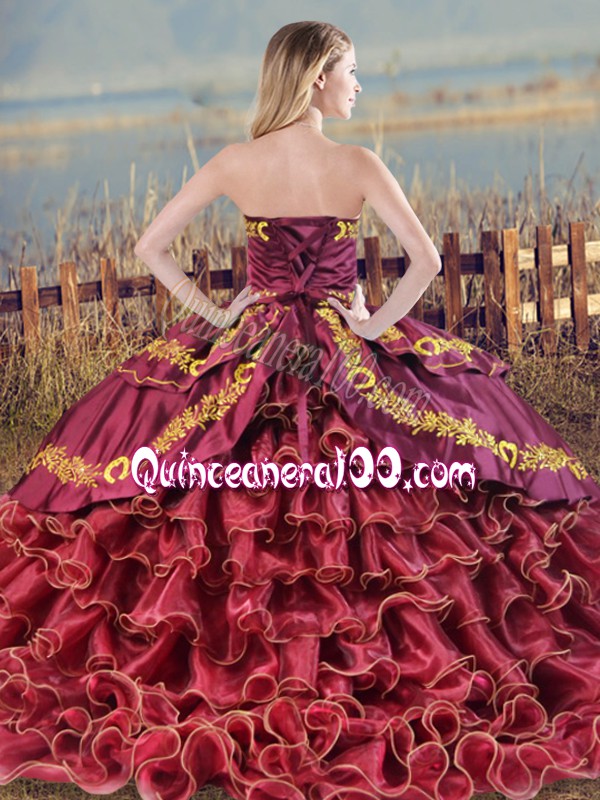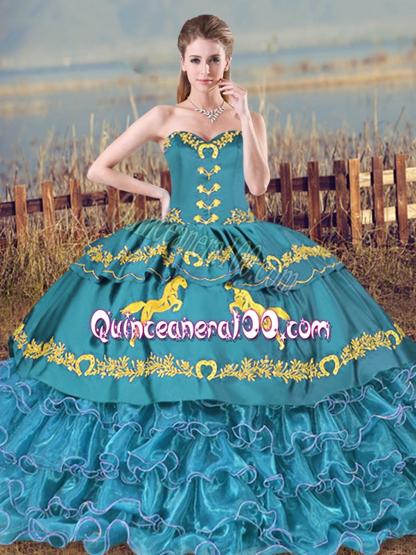 Neckline : SweetheartShown Color : BlueSilhouette : Ball GownsSleeve Length : sleevelessHemline : floor lengthBack Detail : Lace upFabric : Satin,OrganzaEmbellishment : Embroidery,RufflesOccasion : Sweet 16,QuinceaneraSeason : Spring,Summer,Fall,Winter