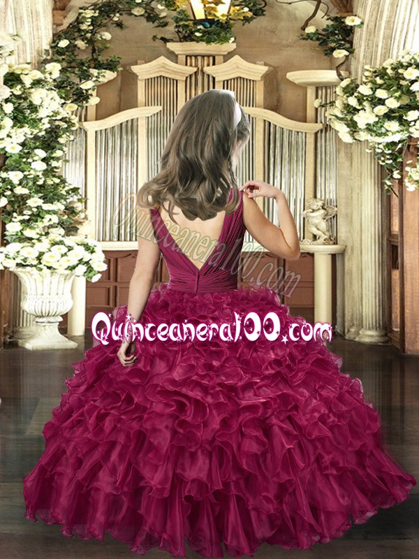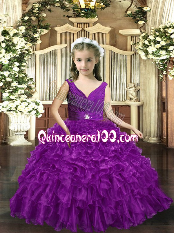 Neckline : V-neckShown Color : Eggplant PurpleSilhouette : Ball GownsSleeve Length : sleevelessHemline : floor lengthBack Detail : BacklessFabric : OrganzaEmbellishment : RufflesOccasion : Party,Sweet 16,Wedding PartySeason : Spring,Summer,Fall,Winter