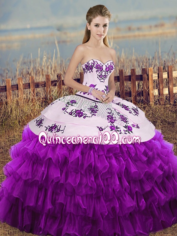 Neckline : SweetheartShown Color : White And PurpleSilhouette : Ball GownsSleeve Length : sleevelessHemline : floor lengthBack Detail : Lace upFabric : OrganzaEmbellishment : Embroidery,Ruffled Layers,BowknotOccasion : Military Ball,Sweet 16,QuinceaneraSeason : Spring,Summer,Fall,Winter