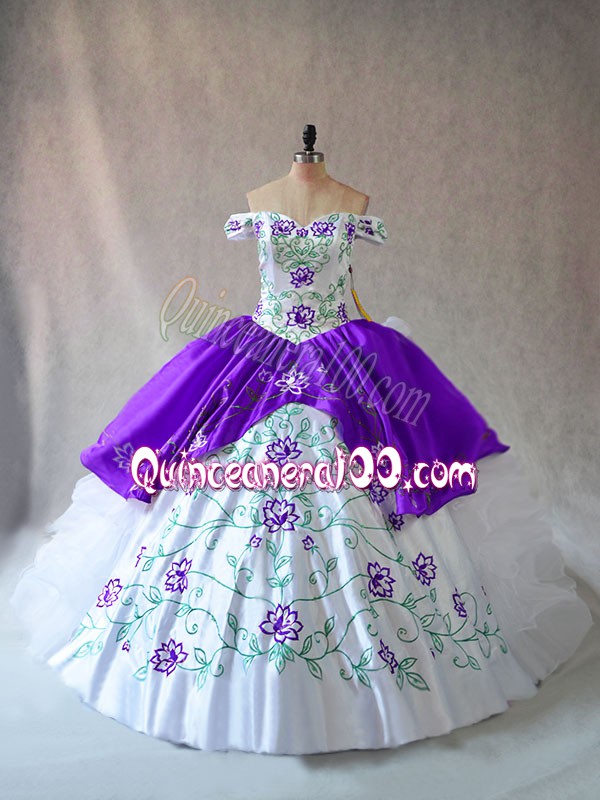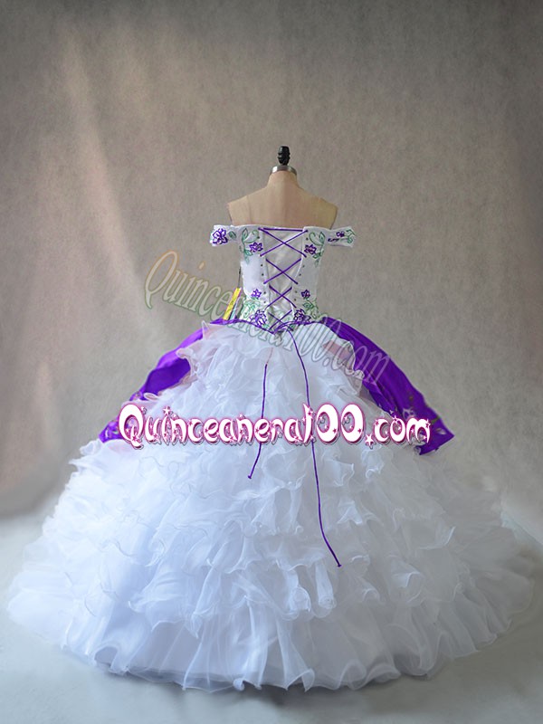 Neckline : Off the shoulderShown Color : White And PurpleSilhouette : Ball GownsSleeve Length : sleevelessHemline : floor lengthBack Detail : Lace upFabric : OrganzaEmbellishment : Embroidery,RufflesOccasion : Sweet 16,QuinceaneraSeason : Spring,Summer,Fall,Winter