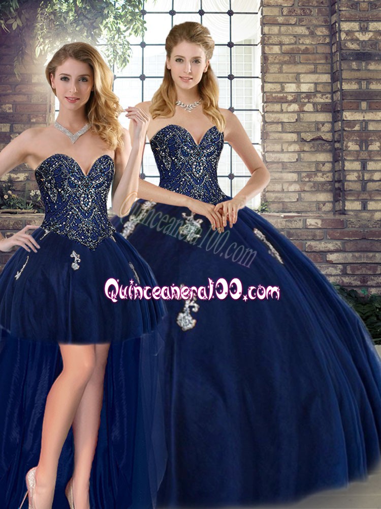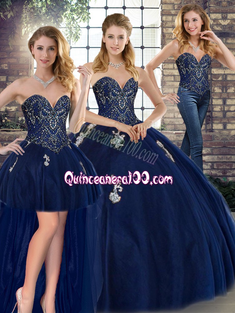Neckline : Sweetheart Shown Color : Navy Blue Silhouette : Three Pieces Sleeve Length : sleeveless Hemline : floor length Back Detail : Lace up Fabric : Tulle Embellishment : Beading,Appliques Occasion : Military Ball,Sweet 16,Quinceanera Season : Spring,Summer,Fall