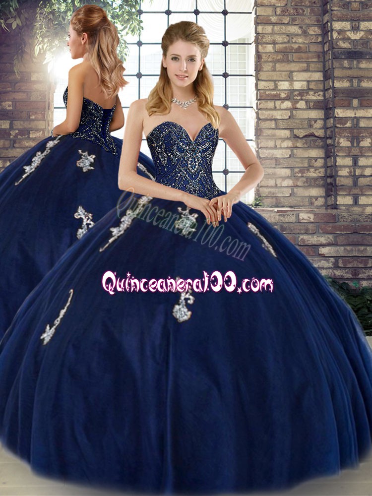 Decent Navy Blue Quinceanera Gowns Military Ball and Sweet 16 and Quinceanera with Beading and Appliques Sweetheart Sleeveless Lace Up