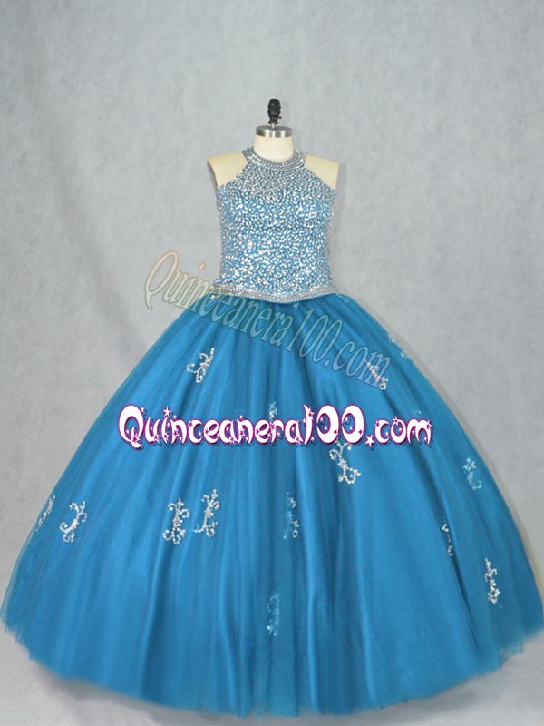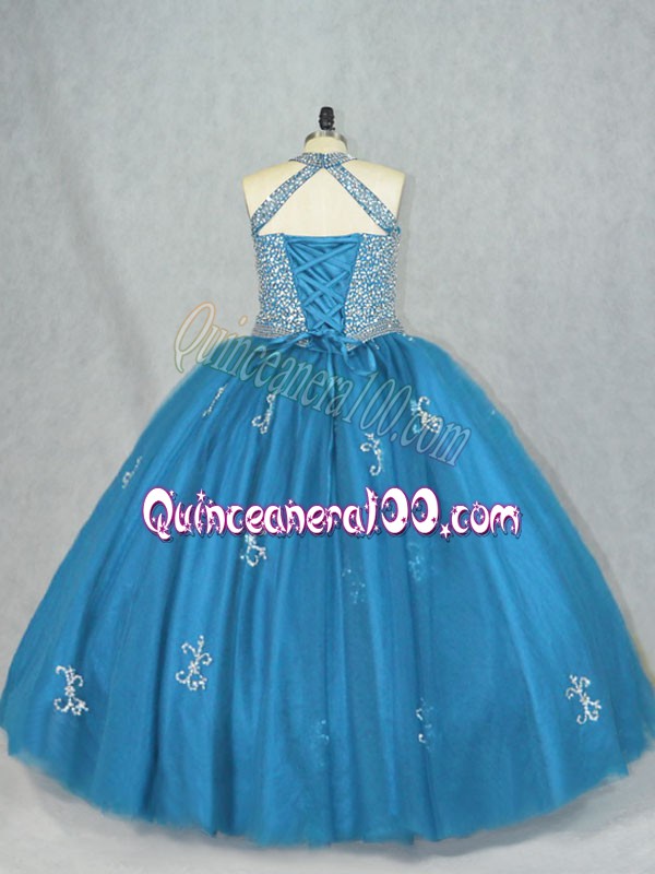Neckline : Halter topShown Color : BlueSilhouette : Ball GownsSleeve Length : sleevelessHemline : floor lengthBack Detail : Lace upFabric : TulleEmbellishment : Beading,AppliquesOccasion : Sweet 16,QuinceaneraSeason : Spring,Summer,Fall,Winter