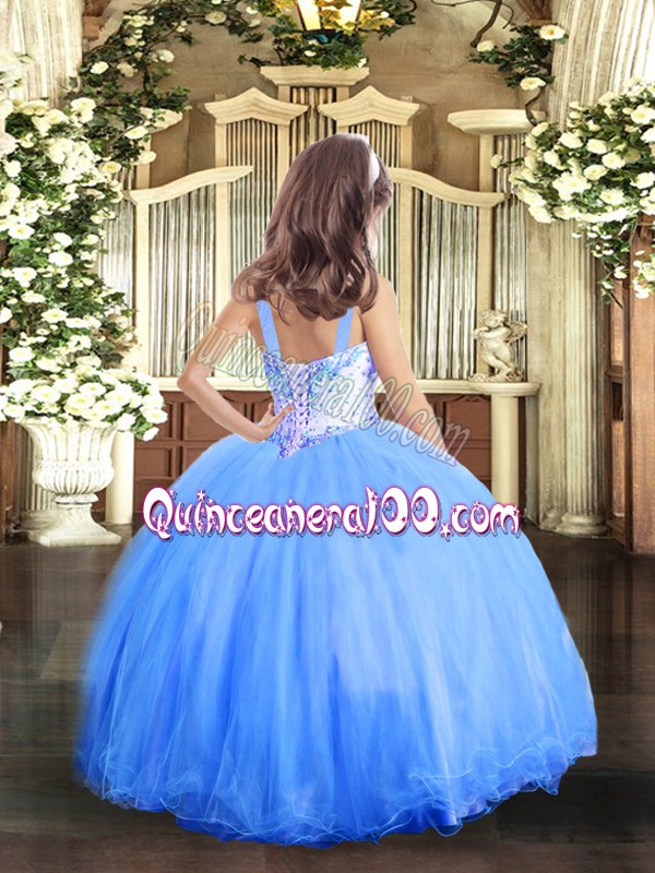 Neckline : StrapsShown Color : BlueSilhouette : Ball GownsSleeve Length : sleevelessHemline : floor lengthBack Detail : Lace upFabric : TulleEmbellishment : BeadingOccasion : Party,Sweet 16,Wedding PartySeason : Spring,Summer,Fall,Winter