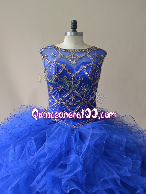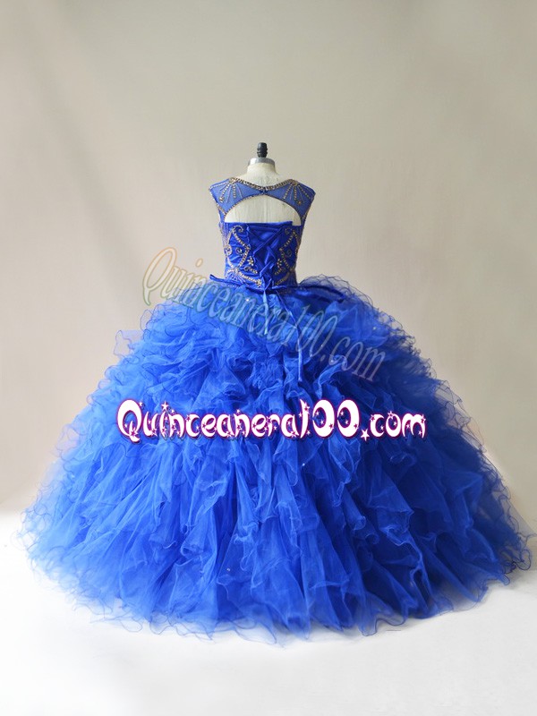 Neckline : ScoopShown Color : Royal BlueSilhouette : Ball GownsSleeve Length : sleevelessHemline : floor lengthBack Detail : Lace upFabric : TulleEmbellishment : Beading,RufflesOccasion : Sweet 16,QuinceaneraSeason : Spring,Summer,Fall,Winter