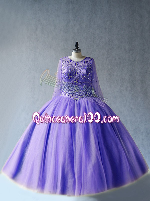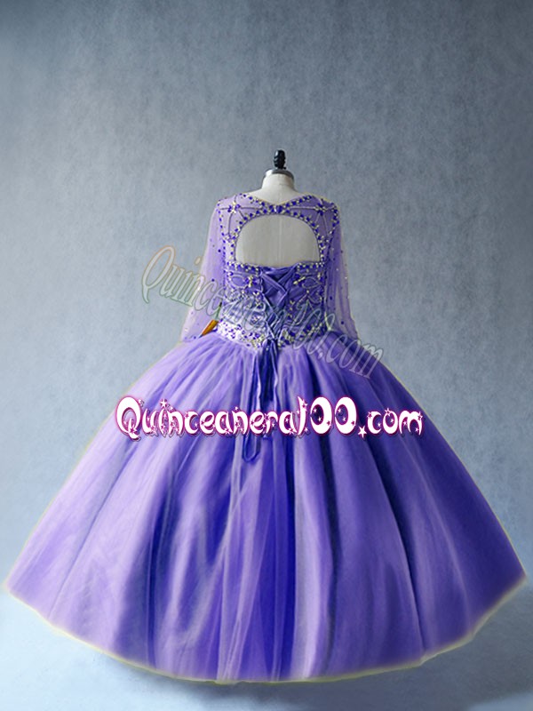 Neckline : ScoopShown Color : LavenderSilhouette : Ball GownsSleeve Length : long sleevesHemline : floor lengthBack Detail : Lace upFabric : TulleEmbellishment : BeadingOccasion : Sweet 16,QuinceaneraSeason : Spring,Summer,Fall,Winter