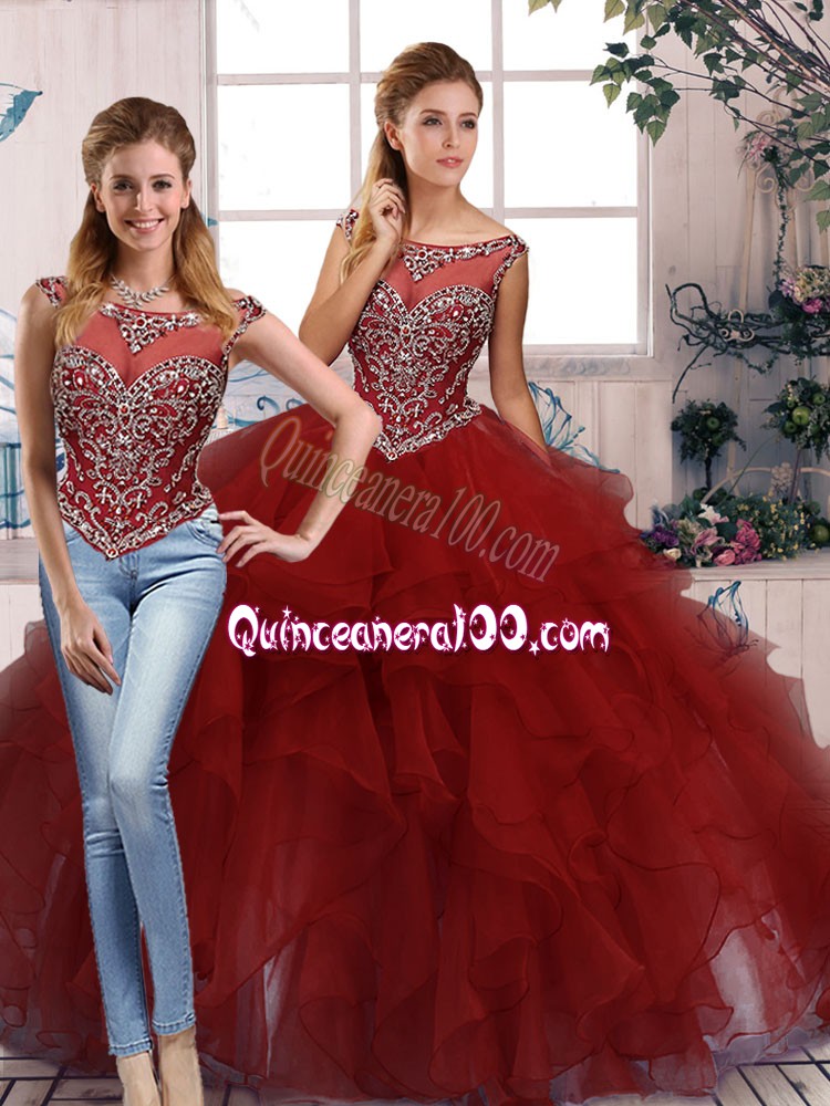 Neckline : ScoopShown Color : BurgundySilhouette : Two PiecesSleeve Length : sleevelessHemline : floor lengthBack Detail : ZipperFabric : OrganzaEmbellishment : Beading,RufflesOccasion : Military Ball,Sweet 16,QuinceaneraSeason : Spring,Summer,Fall,Winter