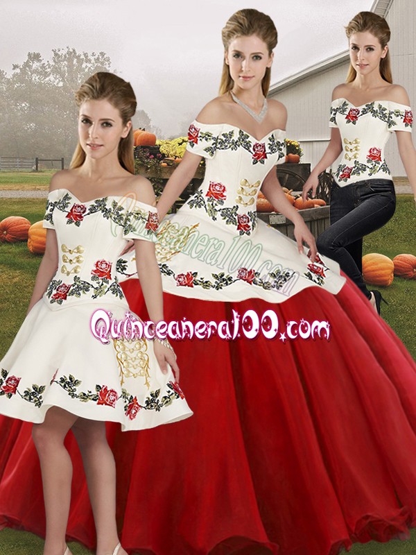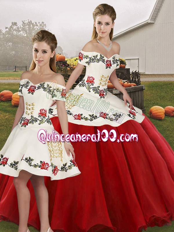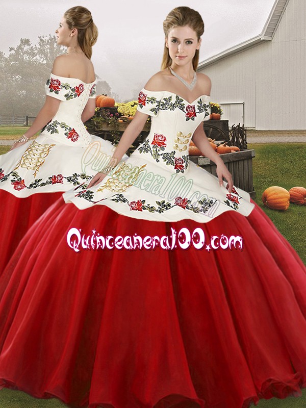 Neckline : Off the shoulder Shown Color : White And Red Sleeve Length : sleeveless Hemline : floor length Back Detail : Lace up Fabric : Organza Embellishment : Embroidery Occasion : Military Ball,Sweet 16,Quinceanera Season : Spring,Summer,Fall,Winter