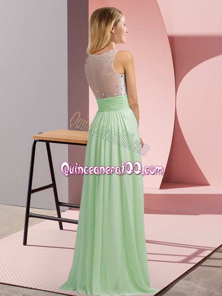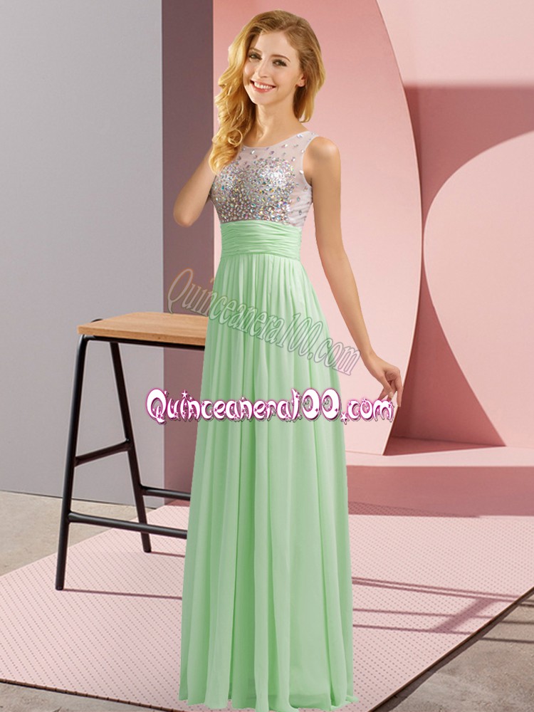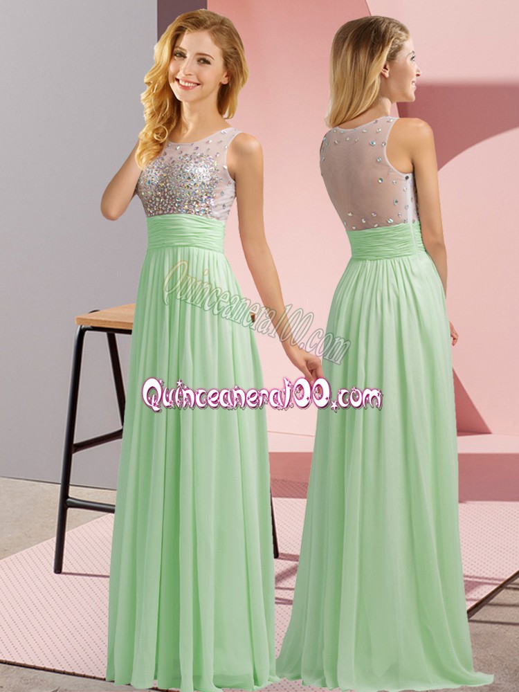 Neckline : ScoopShown Color : Apple GreenSilhouette : EmpireSleeve Length : sleevelessHemline : floor lengthBack Detail : Side zipperFabric : ChiffonEmbellishment : BeadingOccasion : Wedding PartySeason : Spring,Summer,Fall,Winter