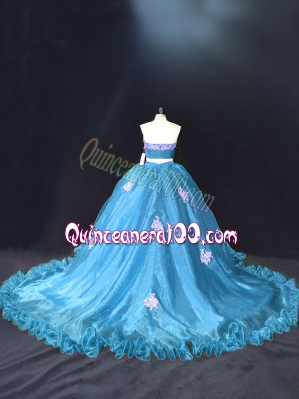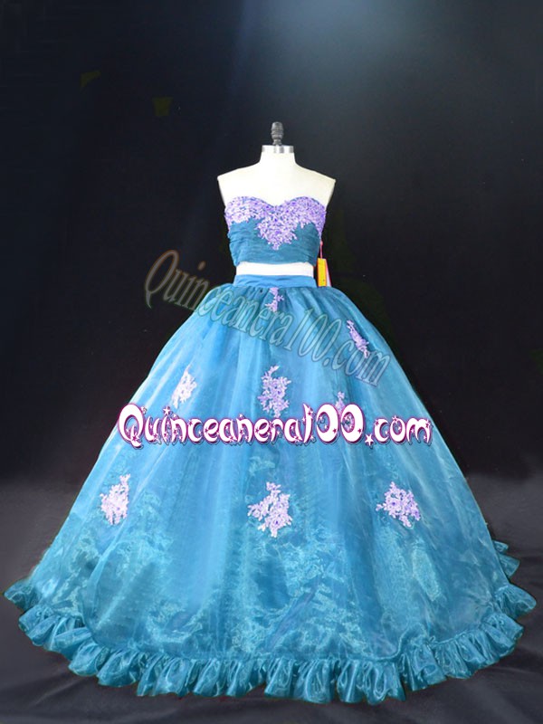 Neckline : SweetheartShown Color : Aqua BlueSilhouette : Ball GownsSleeve Length : sleevelessBack Detail : ZipperFabric : OrganzaEmbellishment : AppliquesOccasion : Sweet 16,QuinceaneraSeason : Spring,Summer,Fall,Winter