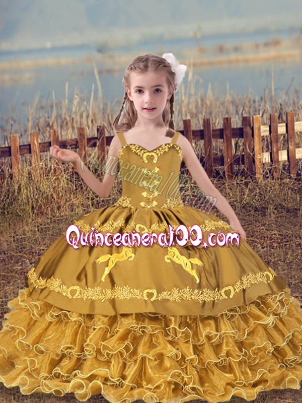 Neckline : StrapsShown Color : GoldSilhouette : Ball GownsSleeve Length : sleevelessHemline : floor lengthBack Detail : Lace upFabric : OrganzaEmbellishment : Beading,Embroidery,Ruffled LayersOccasion : Wedding PartySeason : Spring,Summer,Fall,Winter