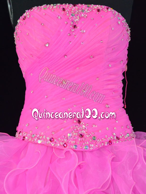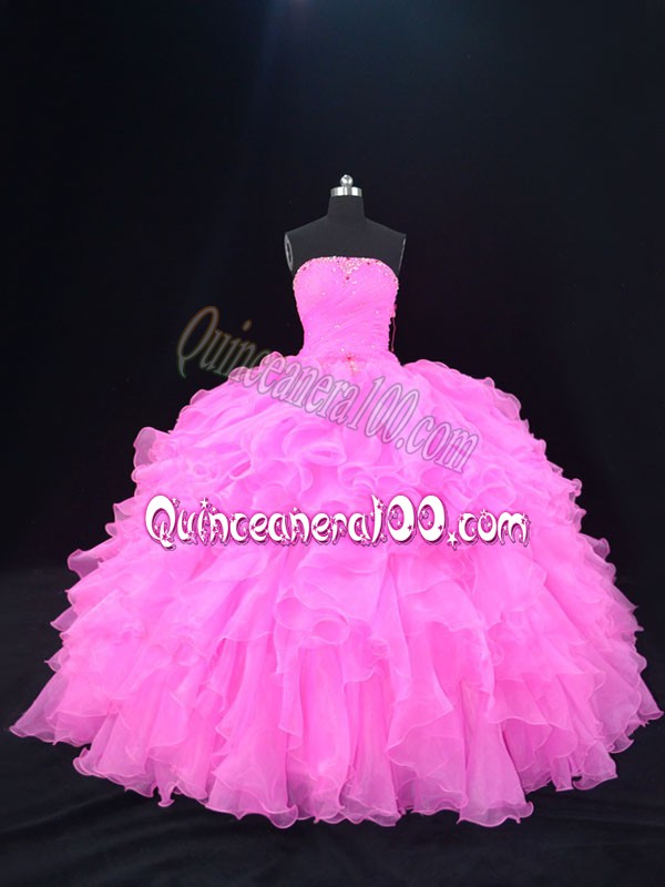 Neckline : StraplessShown Color : Pink ,Rose Pink Silhouette : Ball GownsSleeve Length : sleevelessHemline : floor lengthBack Detail : Lace upFabric : OrganzaEmbellishment : Beading,RufflesOccasion : Sweet 16,QuinceaneraSeason : Spring,Summer,Fall,Winter