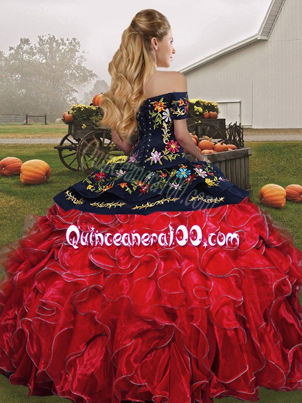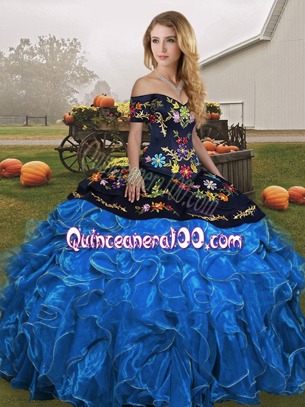 Neckline : Off the shoulder Shown Color : Blue And Black Silhouette : Ball Gowns Sleeve Length : sleeveless Hemline : floor length Back Detail : Lace up Fabric : Organza Embellishment : Embroidery,Ruffles Occasion : Military Ball,Sweet 16,Quinceanera Season : Spring,Summer,Fall,Winter