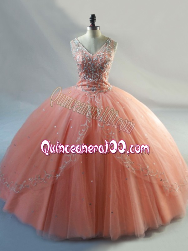 Neckline : V-neckShown Color : PeachSilhouette : Ball GownsSleeve Length : sleevelessHemline : floor lengthBack Detail : Lace upFabric : TulleEmbellishment : BeadingOccasion : Sweet 16,QuinceaneraSeason : Spring,Summer,Fall,Winter