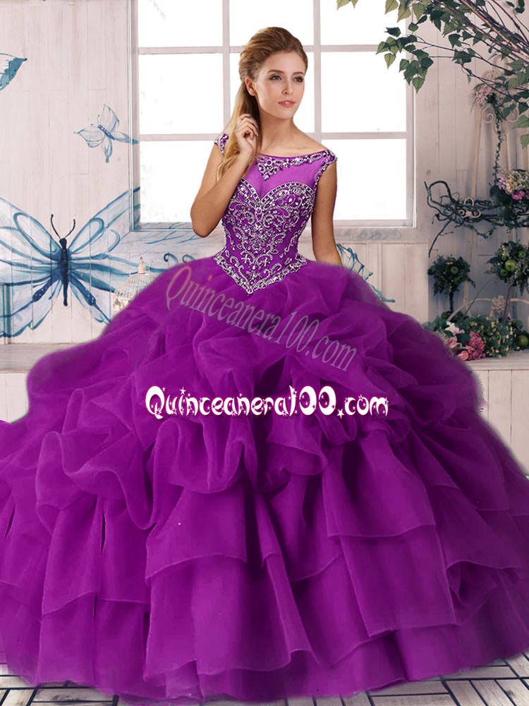 Neckline : ScoopShown Color : PurpleSilhouette : Ball GownsSleeve Length : sleevelessBack Detail : ZipperFabric : OrganzaEmbellishment : Beading,Pick UpsOccasion : Military Ball,Sweet 16,QuinceaneraSeason : Spring,Summer,Fall,Winter