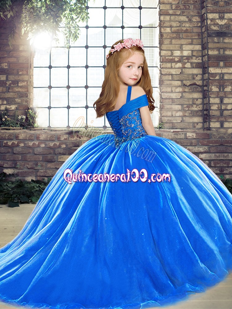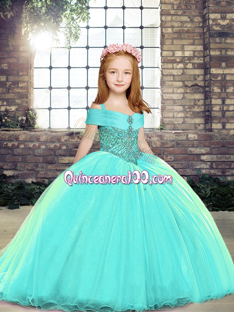 Aqua Blue Straps Lace Up Beading Little Girls Pageant Dress Brush Train Sleeveless