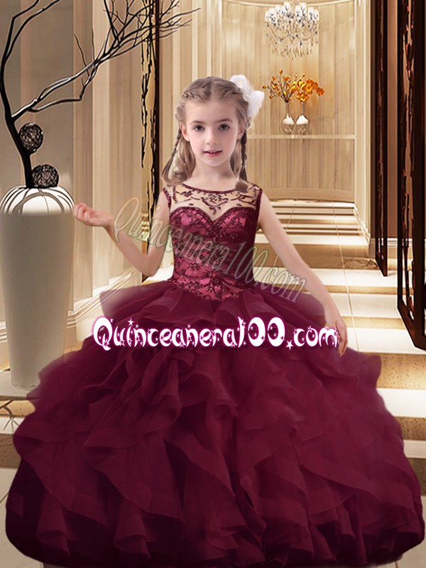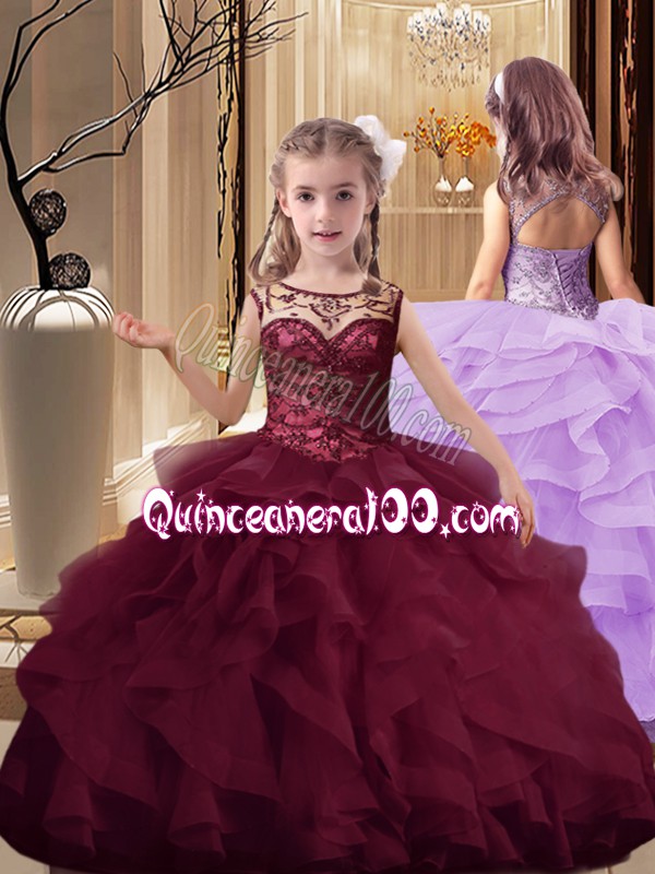 Neckline : ScoopShown Color : BurgundySilhouette : Ball GownsSleeve Length : sleevelessBack Detail : Lace upFabric : OrganzaEmbellishment : Beading,RufflesOccasion : Party,Wedding PartySeason : Spring,Summer,Fall,Winter