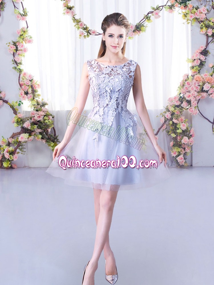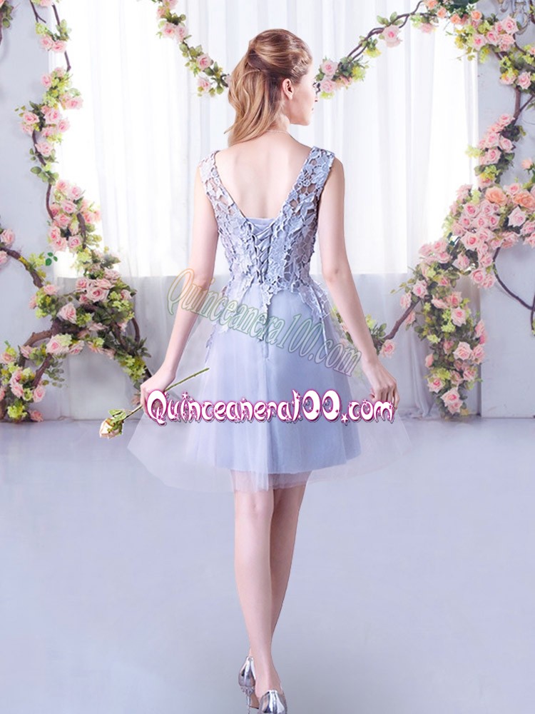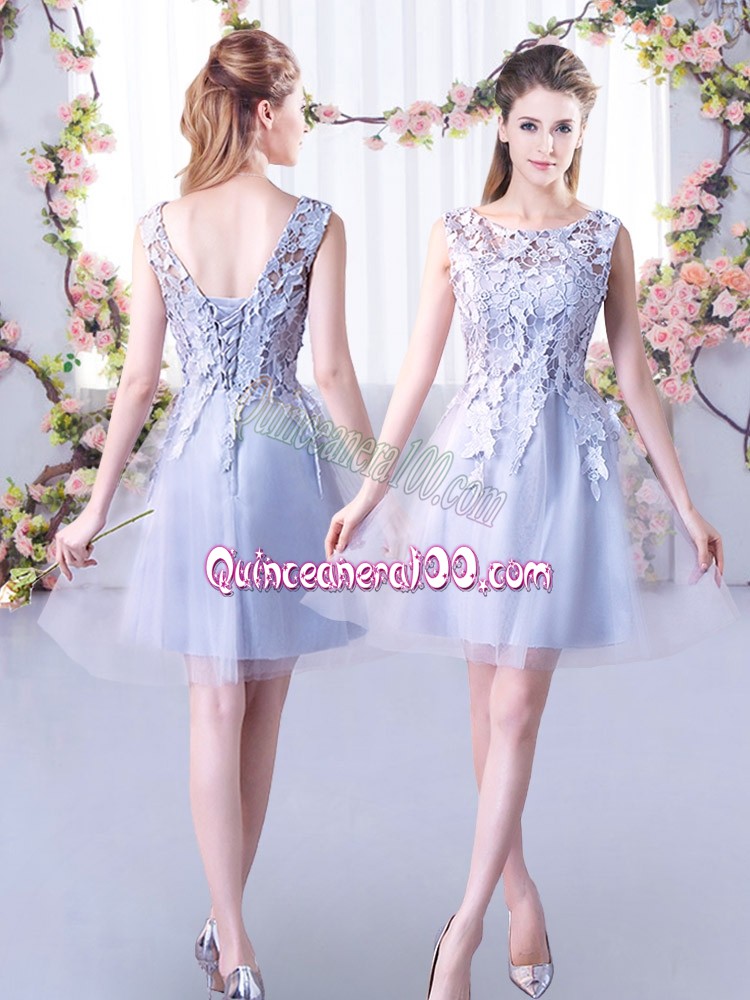 Neckline : ScoopShown Color : GreySilhouette : A-lineSleeve Length : sleevelessHemline : mini lengthBack Detail : Lace upFabric : TulleEmbellishment : LaceOccasion : Wedding PartySeason : Spring,Summer,Fall