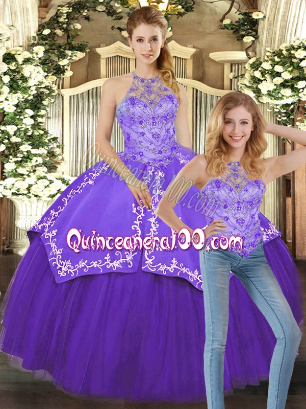 Neckline : Halter topShown Color : PurpleSilhouette : Two PiecesSleeve Length : sleevelessHemline : floor lengthBack Detail : Lace upFabric : Satin,TulleEmbellishment : Beading,EmbroideryOccasion : Military Ball,Sweet 16,QuinceaneraSeason : Spring,Summer,Fall,Winter