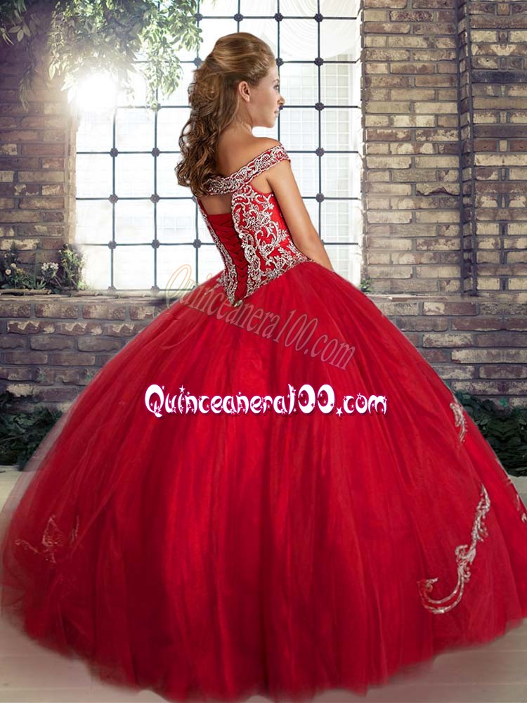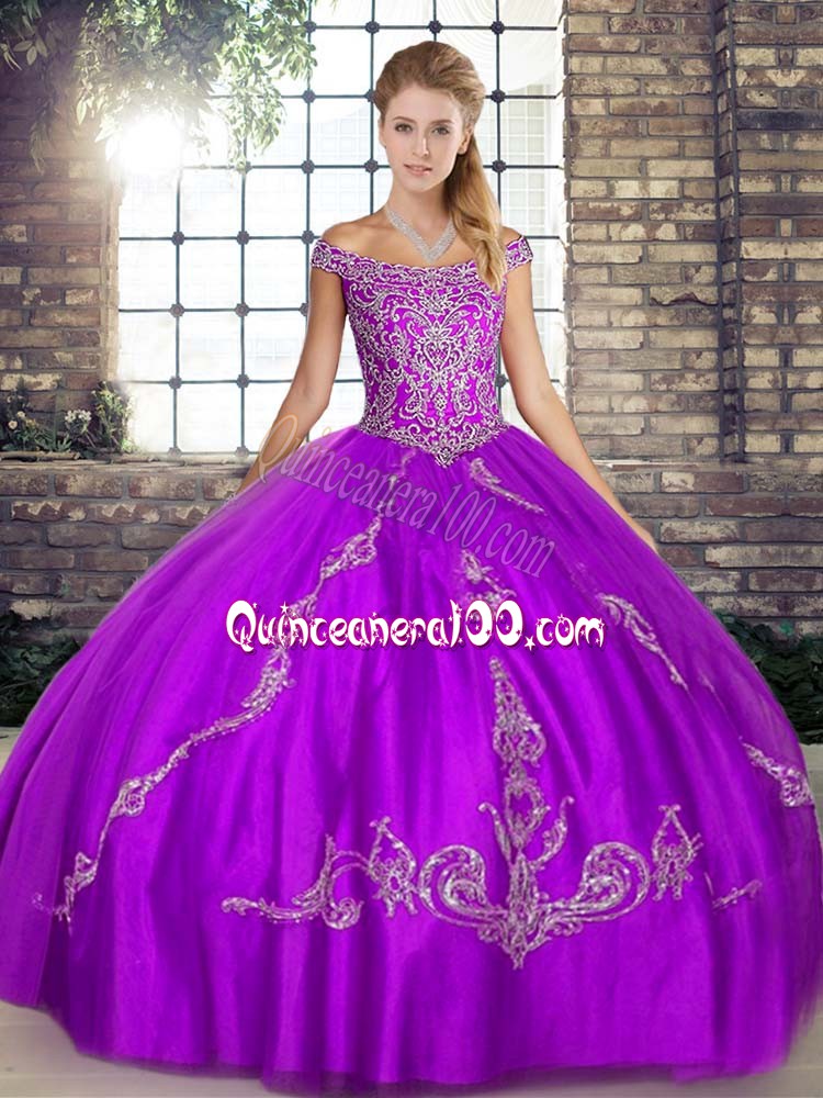 Neckline : Off the shoulderShown Color : PurpleSilhouette : Ball GownsSleeve Length : sleevelessHemline : floor lengthBack Detail : Lace upFabric : TulleEmbellishment : Beading,EmbroideryOccasion : Military Ball,Sweet 16,QuinceaneraSeason : Spring,Summer,Fall,Winter